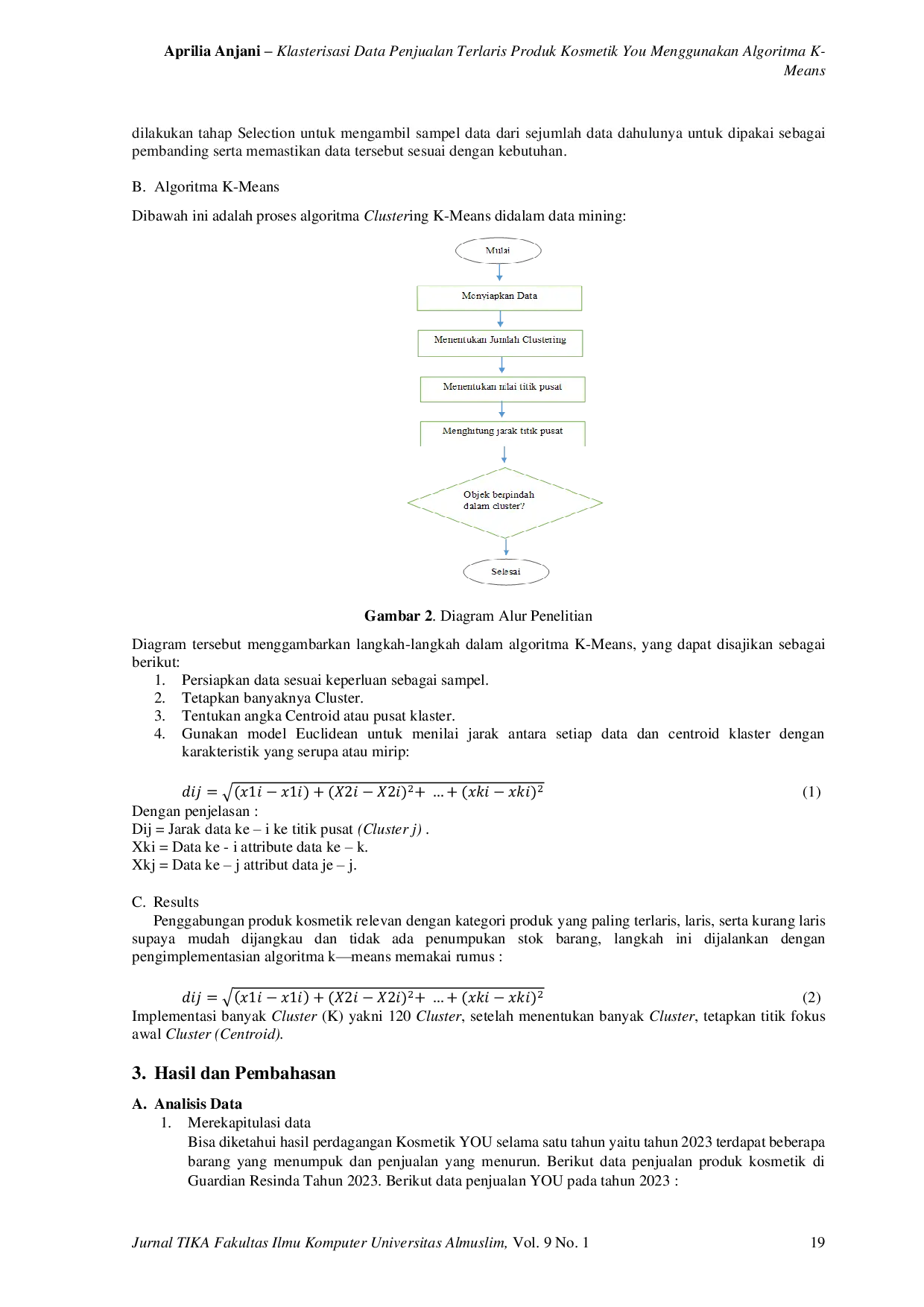 Jurnal TikaJurnal TikaAda banyak jenis bisnis di Indonesia yang menyita fokus masyarakat serta meningkatkan kompetisi dengan menghasilkan kreativitas dalam berbagai gagasan bisnis. Perusahaan kosmetik dan perawatan kulit indonesia merupakan brand kosmetik Y.O.U yang didedikasikan untuk kecantikan wanita indonesia, diproduksi sesuai dengan kebutuhan masyarakat dan tren saat ini. Tugas data mining adalah mengumpulkan atau mengelompokkan data dalam jumlah besar berdasarkan berbagai kriteria yang telah ditentukan. Cluster data mining sangat ideal sebagai algoritma yang bisa mengelola data dengan cara lebih efisien, seperti algoritma K-Means. Algoritma Clustering K-Means ialah prosedur yang digunakan untuk menggabungkan beberapa aliran data untuk menganalisis data dan menentukan jumlah Cluster yang memiliki karakteristik berbeda dari data lainnya. Temuan yang diinginkan ialah terdapatnya kumpulan data yang berdampak bagi strategi penjualan pada periode berikutnya sehingga dapat mengetahui barang yang paling terlaris yang dijual dan barang yang kurang laris. Kebijakan ini bisa menyusutkan defisit yang didapat oleh PT Jalur Mandiri utama dahulunya pada kosmetik YOU. Dengan data tersebut dapat dikelompokan menjadi 3 Clustering yang didasarkan pada tingkat kesuksesan penjualan suatu jenis produk Cluster 0 yang terdiri dari 8 produk item yang memiliki tingkat penjualan laris, Sedangkan Dalam Cluster 1 yang mencakup 12 item produk dengan kategori paling laris dan Cluster 2 yang terdiri dari 5 item produk yang tidak laris, dalam Cluster ini menunjukkan tren tetap atau bahkan menurun dari bulan ke bulan dengan nilai Centroid menunjukkan ketidakpopuleran produk-produk tersebut di pasar.