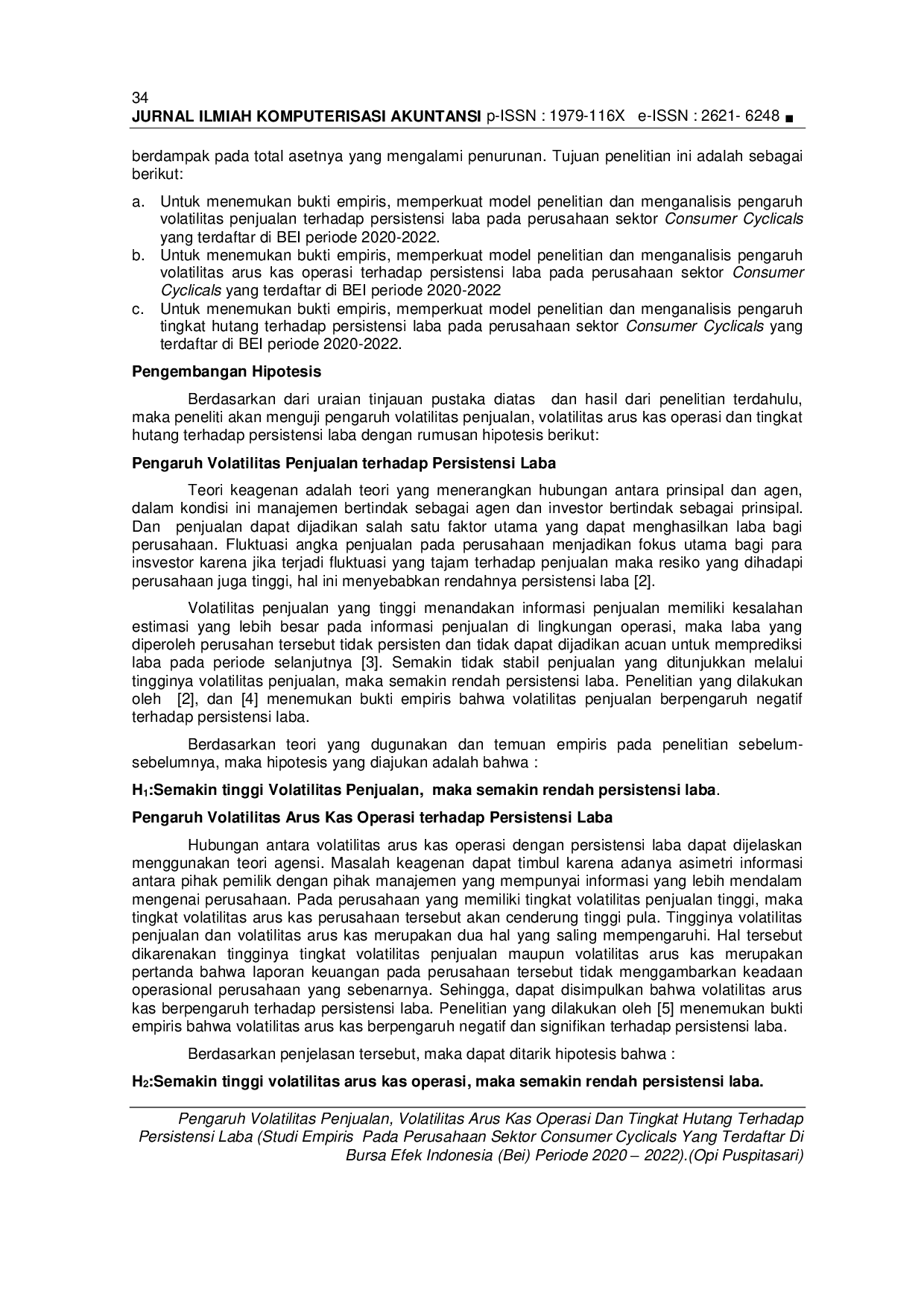 Kompak :Jurnal Ilmiah Komputerisasi AkuntansiKompak :Jurnal Ilmiah Komputerisasi AkuntansiPenelitian ini bertujuan untuk menguji dan menemukan bukti empiris yang memperkuat model penelitian serta menganalisis dan sebagai bahan ajar tentang pengaruh volatilitas penjualan, volatilitas arus kas operasi dan tingkat hutang terhadap persistensi laba (studi empiris pada perusahaan sektor consumer cyclicals yang terdaftar di BEI periode 2020-2022). Metode yang digunakan dalam pengambilan sampel adalah Purposive Sampling. Data yang digunakan adalah data sekunder berupa laporan keuangan perusahaan yang terdaftar di BEI selama tahun 2020 hingga 2022. Jumlah sampel yang digunakan dalam penelitian ini sebanyak 105 data. Hasil yang diperoleh dalam penelitian ini adalah menunjukkan bahwa variabel Volatilitas Penjualan berpengaruh terhadap Persistensi Laba, Volatilitas Arus Kas Operasi berpengaruh terhadap Persistensi Laba, Tingkat Hutang berpengaruh pada Persistensi Laba pada Perusahaan Sektor Consumer Cyclicals yang Terdaftar di Bursa Efek Indonesia (BEI) Periode 2020 - 2022.