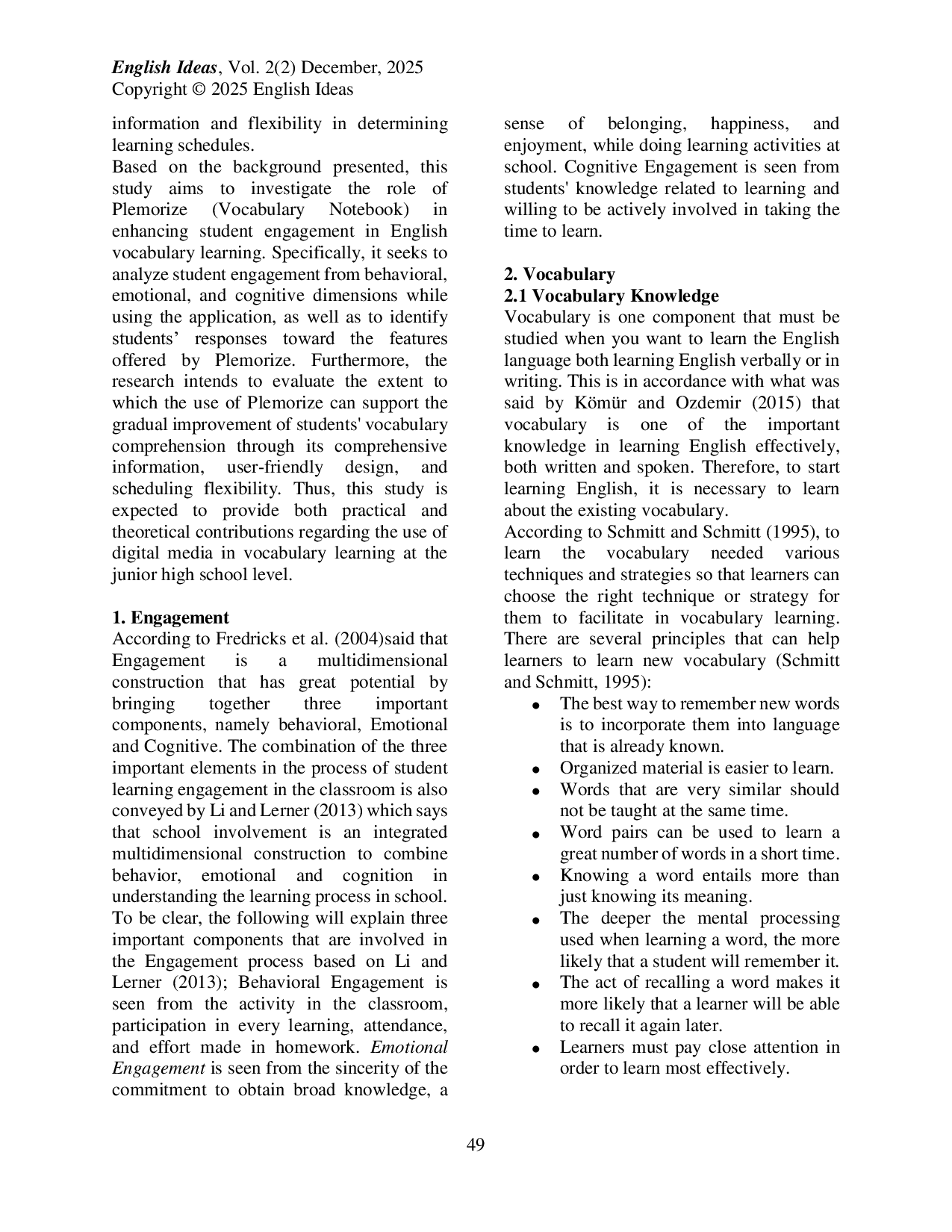 English Ideas: Journal of English Language EducationEnglish Ideas: Journal of English Language EducationPenelitian ini menyelidiki penggunaan Plemorize, sebuah aplikasi catatan kosakata digital, sebagai cara untuk meningkatkan keterlibatan siswa dalam pemerolehan kosakata. Penelitian ini menggunakan pendekatan studi kasus kualitatif yang melibatkan sembilan siswa kelas tujuh dari sebuah sekolah menengah pertama di Bekasi. Data dikumpulkan melalui wawancara semi-terstruktur dan artefak digital, kemudian dianalisis secara tematik menggunakan kerangka keterlibatan perilaku, emosional, dan kognitif. Hasil penelitian menunjukkan bahwa siswa menunjukkan keterlibatan yang signifikan di ketiga dimensi saat menggunakan Plemorize. Mereka melaporkan bahwa aplikasi tersebut tidak hanya ramah pengguna dan menarik secara visual, tetapi juga mendukung pembelajaran mandiri melalui fitur-fitur seperti pengingat kosakata dan jadwal belajar yang dapat disesuaikan. Temuan ini menunjukkan bahwa alat kosakata digital seperti Plemorize dapat secara efektif melengkapi pedagogi tradisional dengan mendorong motivasi, personalisasi, dan praktik yang konsisten.