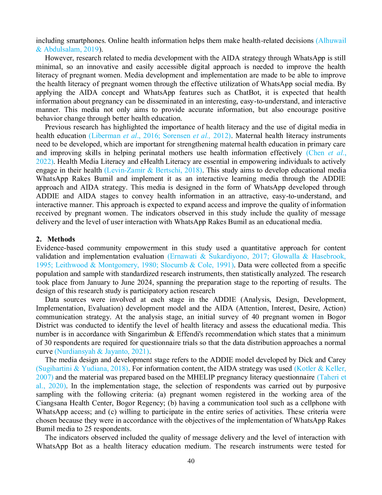 Applied Research in Science and TechnologyApplied Research in Science and TechnologyArtikel ini membahas pengembangan dan implementasi media literasi kesehatan berbasis WhatsApp untuk wanita hamil (Rakes Bumil) sebagai pendekatan pemberdayaan masyarakat menggunakan model ADDIE dan AIDA. Penelitian ini bertujuan untuk mengembangkan dan menerapkan media edukasi Rakes Bumil berbasis WhatsApp dengan menggunakan tahap-tahap ADDIE dan strategi AIDA untuk menyampaikan informasi kesehatan yang akurat dan menarik, sehingga mendorong peningkatan literasi kesehatan wanita hamil, terutama dalam aspek pengetahuan, pencarian, penilaian, dan pengambilan keputusan terkait informasi kehamilan. Penelitian ini menggunakan pendekatan kuantitatif dengan desain penelitian partisipatif untuk validasi konten dan pengembangan, implementasi media edukasi Rakes Bumil sesuai dengan model ADDIE dan strategi AIDA. Hasil penelitian menunjukkan bahwa media dikembangkan melalui tahap-tahap ADDIE, di mana Rakes Bumil memiliki media ChatBot, flyer, video animasi, dan kuis interaktif. Uji kelayakan menunjukkan bahwa media diterima dengan baik oleh wanita hamil, dengan lebih dari 90% wanita hamil menyatakan bahwa media ini layak digunakan untuk mendukung literasi kehamilan. Implementasi selama 14 hari menunjukkan peningkatan keterlibatan dan pemahaman informasi kesehatan. Temuan ini membentuk dasar awal untuk penelitian lebih lanjut tentang efektivitas media.