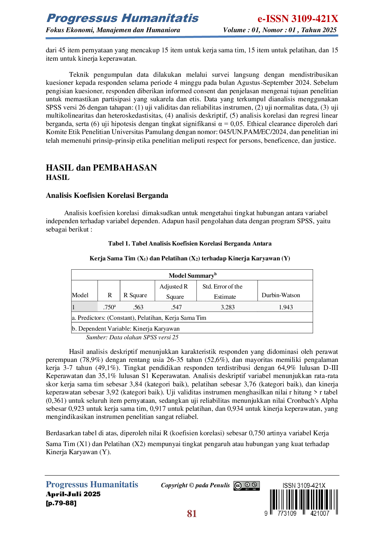 Progressus HumanitatisProgressus HumanitatisPenelitian ini menggunakan metode sensus dengan 57 responden tenaga keperawatan. Tujuannya adalah untuk mengetahui pengaruh kerja sama tim dan pelatihan terhadap kinerja keperawatan di era transformasi digital pelayanan kesehatan. Hasil analisis menunjukkan bahwa kerja sama tim dan pelatihan berpengaruh positif dan signifikan terhadap kinerja, dengan nilai signifikansi 0,001 < 0,05. Secara simultan, kerja sama tim dan pelatihan juga berpengaruh positif dan signifikan terhadap kinerja karyawan. Koefisien determinasi (R²) sebesar 56,3% mengindikasikan bahwa variabel kerja sama tim dan pelatihan mampu menjelaskan variasi dalam kinerja karyawan sebesar 56,3%, sementara sisanya 43,7% dijelaskan oleh faktor lain.