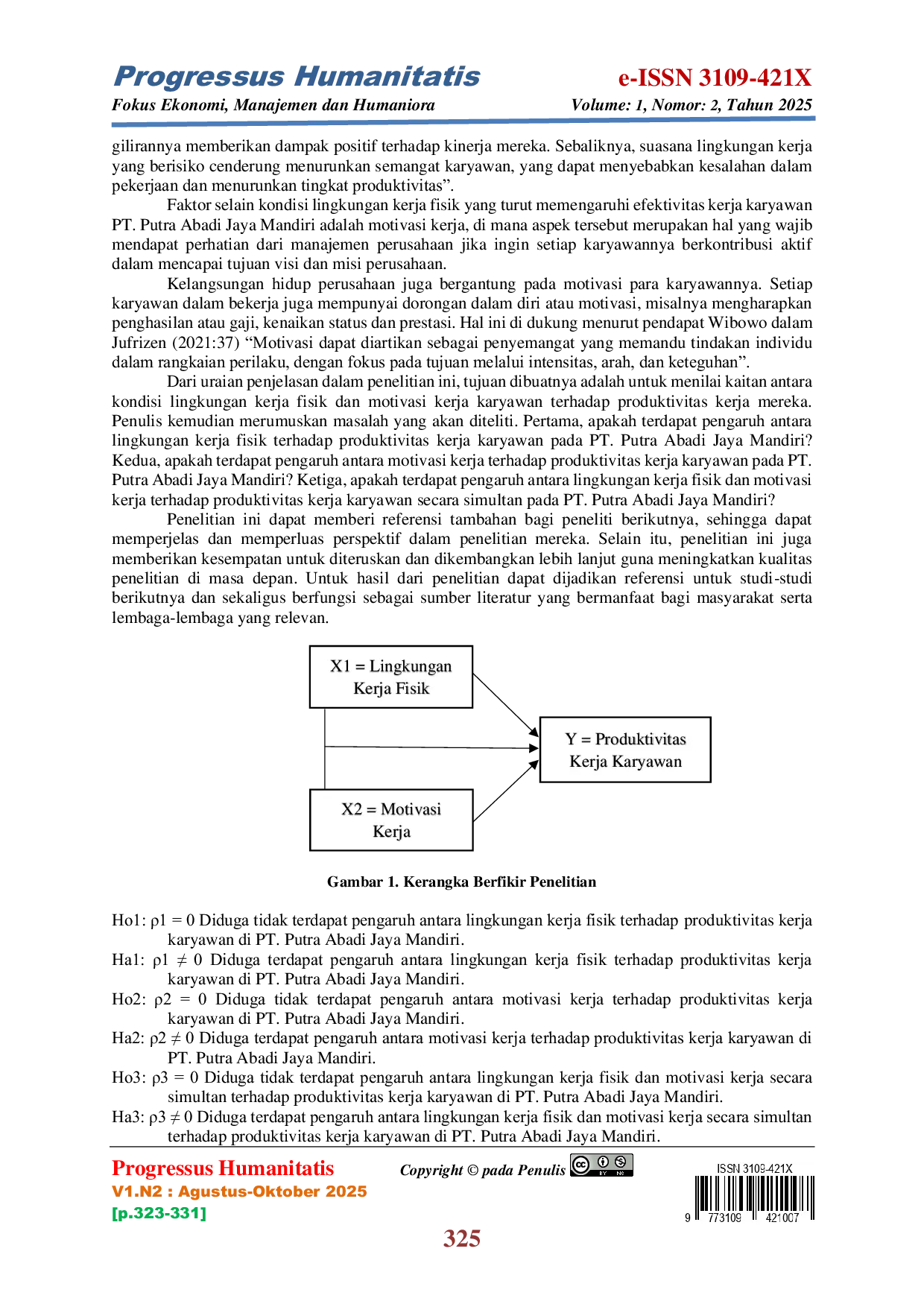 Progressus HumanitatisProgressus HumanitatisPenelitian ini bertujuan untuk mengetahui pengaruh lingkungan kerja fisik dan motivasi kerja terhadap produktivitas kerja karyawan pada PT. Putra Abadi Jaya Mandiri Tangerang Selatan, baik secara parsial maupun simultan. Penelitian ini menggunakan 60 sampel yang telah dihitung menggunakan rumus slovin. Penelitian ini menggunakan metode kuantitatif yang menggunakan ketentuan skala Likert. Pengujian meliputi Analisis Deskriptif, Uji Instrumen Data, Uji Asumsi Klasik, Analisis Kuantitatif, dan Pengujian Hipotesis. Berdasarkan perhitungan regresi linear sederhana, variabel lingkungan kerja fisik memiliki persamaan Y = 2,269 0,926X1, dan variabel motivasi kerja memiliki persamaan Y = 5,149 0,822X2. Perhitungan regresi berganda pada variabel lingkungan kerja fisik (X1) dan motivasi kerja (X2) memiliki persamaan Y = 1,570 0,593X1 0,359X2. Uji t lingkungan kerja fisik memperoleh nilai thitung > ttabel (15,214 > 2,002) dengan nilai signifikansi 0,00 < 0,05, sehingga Ho1 ditolak dan Ha1 diterima, yang berarti lingkungan kerja fisik berpengaruh terhadap produktivitas kerja karyawan. Uji t motivasi kerja memperoleh nilai thitung > ttabel (13,143 > 2,002) dengan nilai signifikansi 0,00 < 0,05, sehingga Ho2 ditolak dan Ha2 diterima, yang berarti motivasi kerja berpengaruh terhadap produktivitas kerja karyawan. Uji F memperoleh nilai Fhitung > Ftabel (148,480 > 2,002) dengan nilai signifikansi 0,00 < 0,05, sehingga Ho3 ditolak dan Ha3 diterima, yang berarti lingkungan kerja fisik dan motivasi kerja berpengaruh secara simultan terhadap produktivitas kerja karyawan.