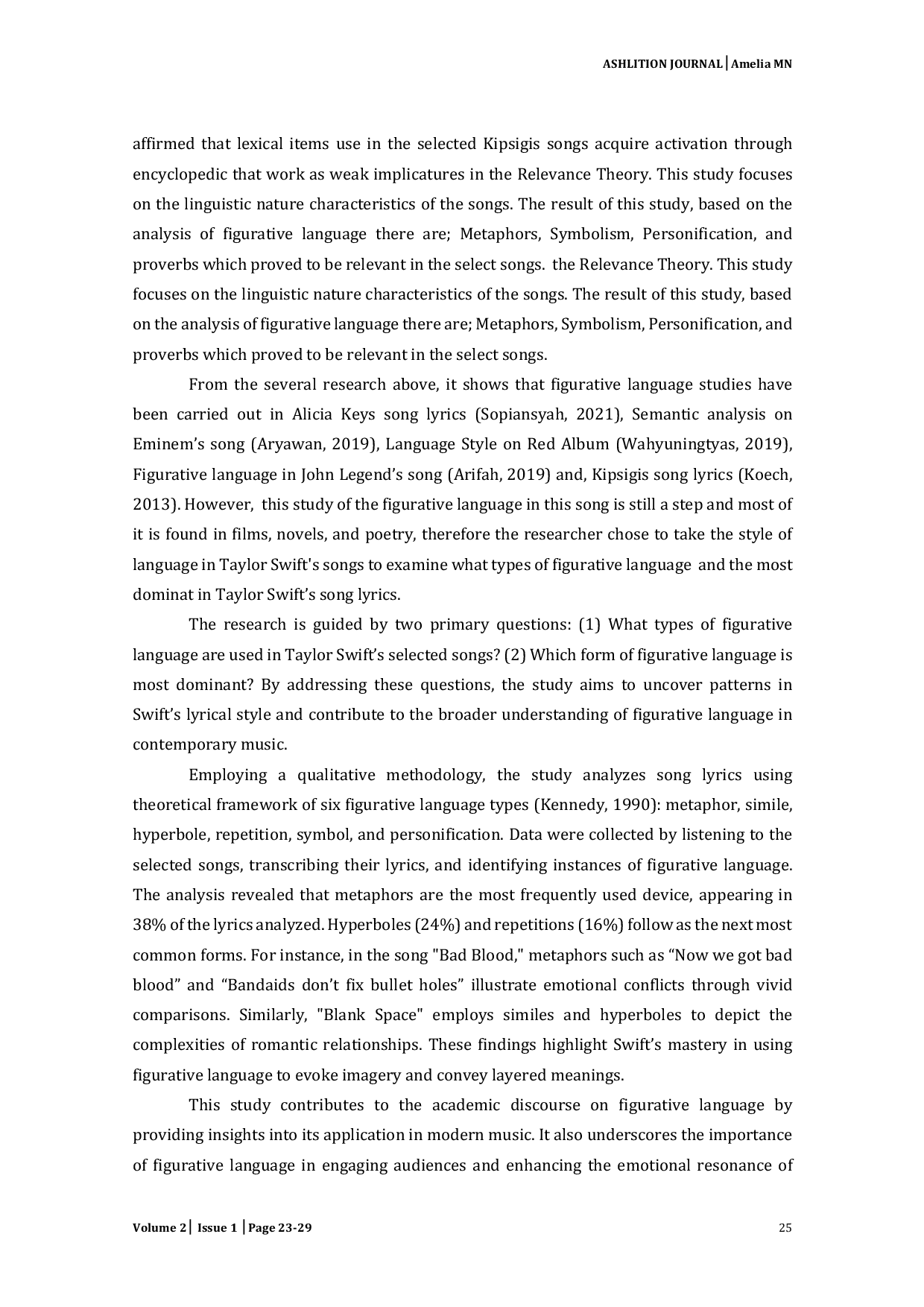ASHLITION : Ash-Shahabah English Literature, Linguistics, & EducationASHLITION : Ash-Shahabah English Literature, Linguistics, & EducationThis study explores the use of figurative language in selected songs by Taylor Swift to understand its prevalence and impact. The primary objectives are to identify the types of figurative language used and determine the most dominant form. Employing a qualitative approach, this research analyzes five songs: Bad Blood, Blank Space, Look What You Made Me Do, End Game, and You Belong With Me. The study utilizes the theoretical framework of Kennedy and Gioia to categorize figurative language into metaphors, similes, hyperboles, repetitions, symbols, and personifications. Findings reveal that metaphors are the most dominant, accounting for 38% of the figurative language, followed by hyperboles (24%) and repetitions (16%). The results underscore the role of figurative language in enriching song lyrics, creating depth, and enhancing listener engagement. These insights provide a foundation for further exploration of figurative language in contemporary music and its relevance to literary studies.