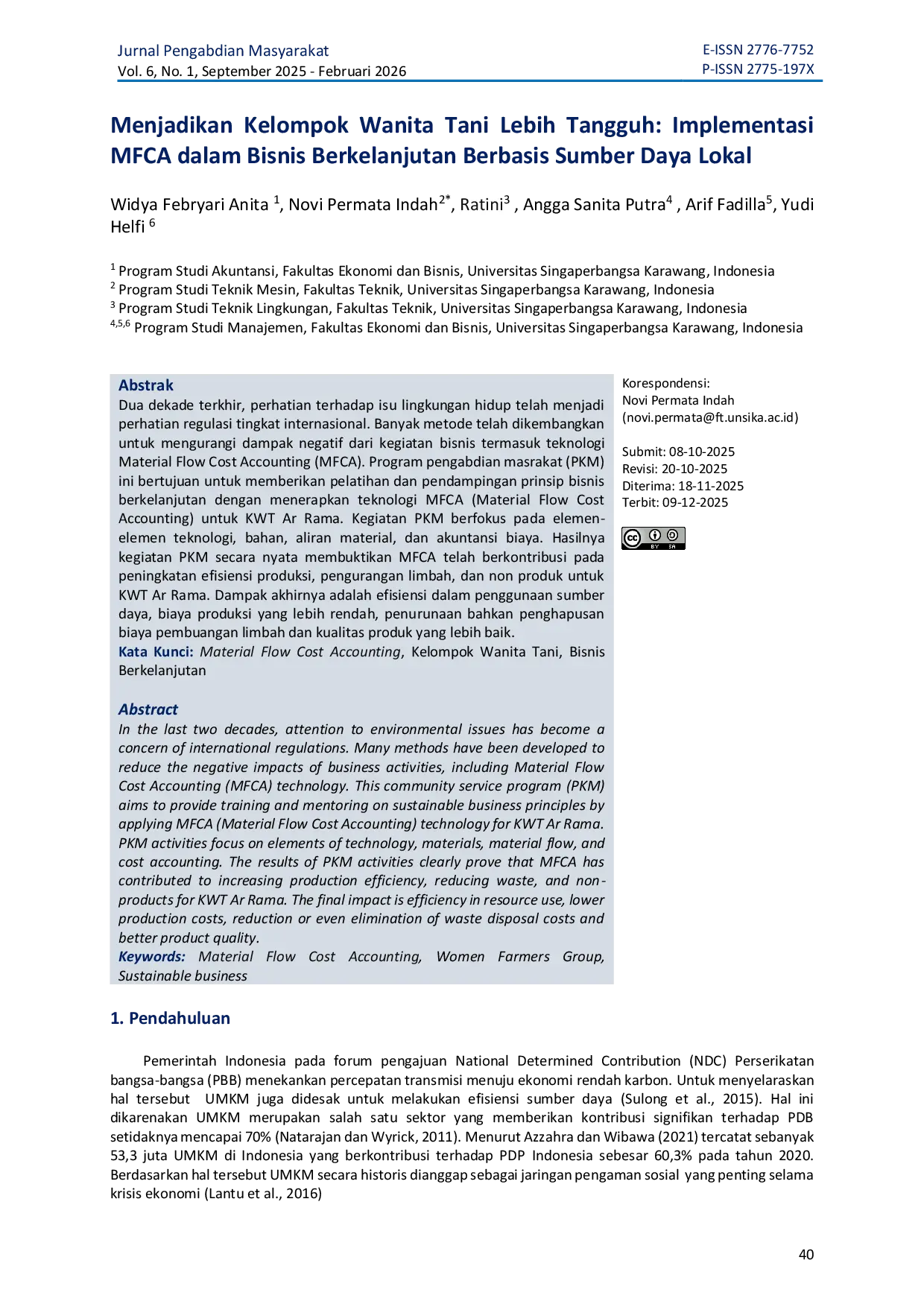 Jurnal Pengabdian MasyarakatJurnal Pengabdian MasyarakatDua dekade terakhir, perhatian terhadap isu lingkungan hidup telah menjadi perhatian regulasi tingkat internasional. Banyak metode telah dikembangkan untuk mengurangi dampak negatif dari kegiatan bisnis termasuk teknologi Material Flow Cost Accounting (MFCA). Program pengabdian masyarakat (PKM) ini bertujuan untuk memberikan pelatihan dan pendampingan prinsip bisnis berkelanjutan dengan menerapkan teknologi MFCA (Material Flow Cost Accounting) untuk KWT Ar Rama. Kegiatan PKM berfokus pada elemen-elemen teknologi, bahan, aliran material, dan akuntansi biaya. Hasilnya kegiatan PKM secara nyata membuktikan MFCA telah berkontribusi pada peningkatan efisiensi produksi, pengurangan limbah, dan non produk untuk KWT Ar Rama. Dampak akhirnya adalah efisiensi dalam penggunaan sumber daya, biaya produksi yang lebih rendah, penurunan bahkan penghapusan biaya pembuangan limbah dan kualitas produk yang lebih baik.
