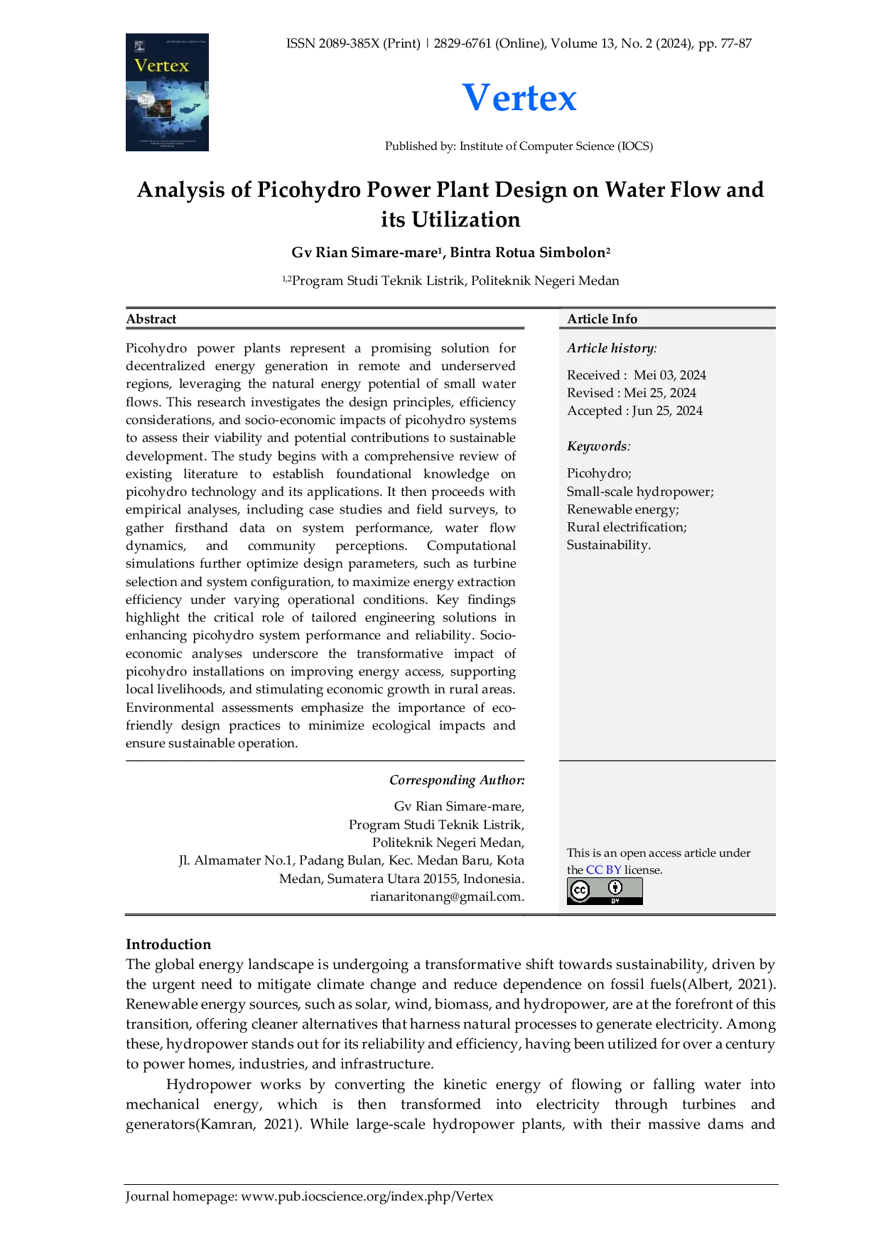 VertexVertexPicohydro power plants represent a promising solution for decentralized energy generation in remote and underserved regions, leveraging the natural energy potential of small water flows. This research investigates the design principles, efficiency considerations, and socio-economic impacts of picohydro systems to assess their viability and potential contributions to sustainable development. The study begins with a comprehensive review of existing literature to establish foundational knowledge on picohydro technology and its applications. It then proceeds with empirical analyses, including case studies and field surveys, to gather firsthand data on system performance, water flow dynamics, and community perceptions. Computational simulations further optimize design parameters, such as turbine selection and system configuration, to maximize energy extraction efficiency under varying operational conditions. Key findings highlight the critical role of tailored engineering solutions in enhancing picohydro system performance and reliability. Socio-economic analyses underscore the transformative impact of picohydro installations on improving energy access, supporting local livelihoods, and stimulating economic growth in rural areas. Environmental assessments emphasize the importance of eco-friendly design practices to minimize ecological impacts and ensure sustainable operation.