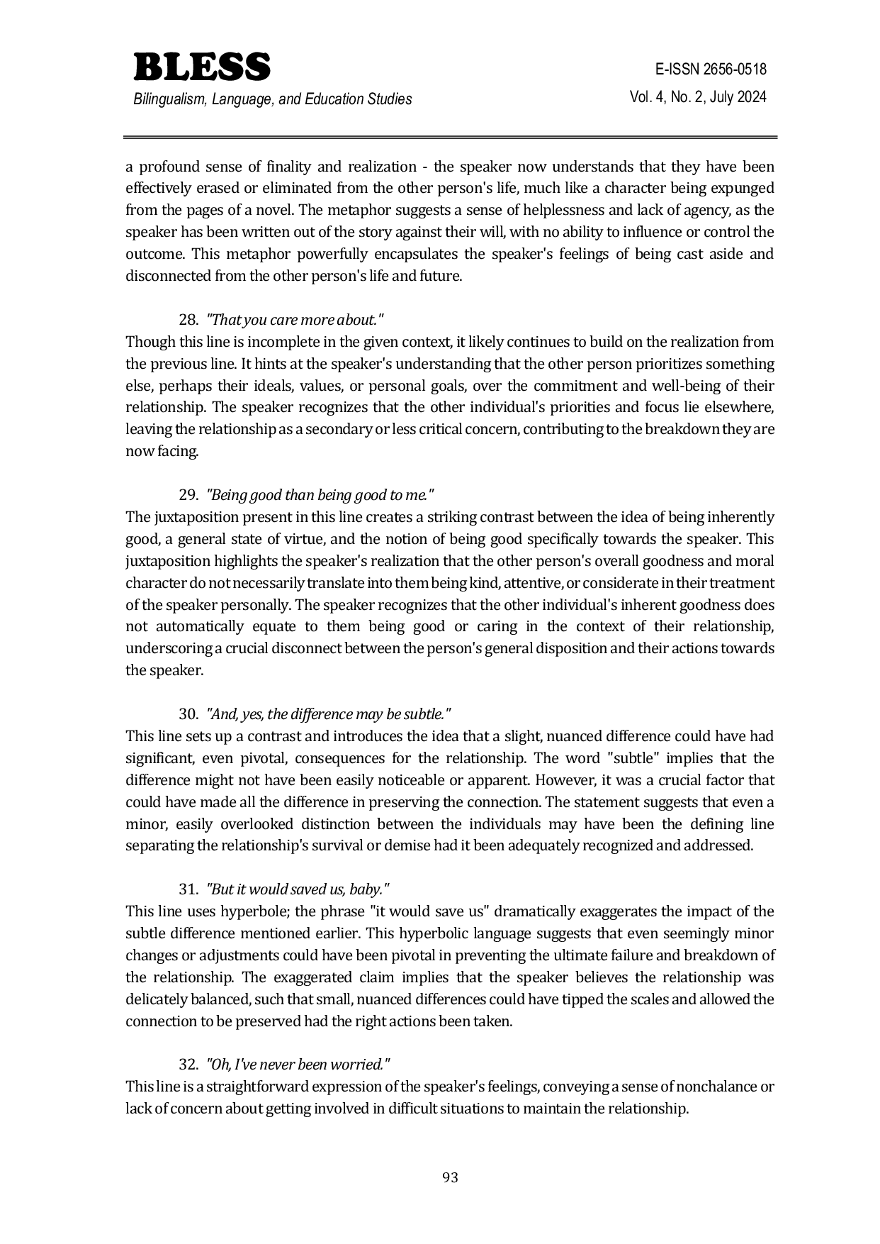 Penelitian selanjutnya dapat memperluas cakupan analisis dengan mengeksplorasi berbagai pilihan lagu dari genre dan artis yang berbeda untuk mendapatkan wawasan yang lebih komprehensif tentang bagaimana bahasa kiasan digunakan dalam komposisi musik yang beragam. Selain itu, penerapan kerangka teoretis alternatif atau pendekatan analitis yang berbeda dalam studi bahasa dalam lirik lagu dapat membuka perspektif dan pemahaman baru. Lebih lanjut, penelitian dapat menyelidiki bagaimana konteks budaya dan sosial memengaruhi interpretasi bahasa kiasan dalam lirik lagu, serta bagaimana penggunaan bahasa kiasan berkontribusi pada pengalaman emosional pendengar.