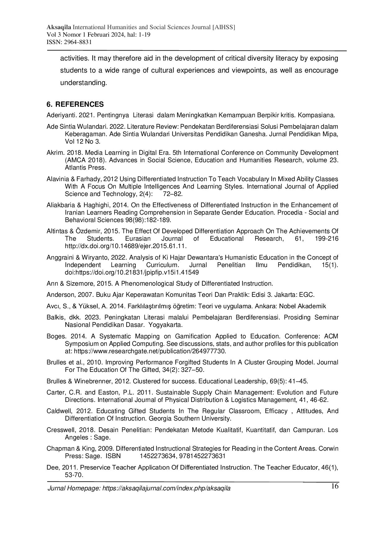 Aksaqila International Humanities and Social Sciences [AIHSS] JournalAksaqila International Humanities and Social Sciences [AIHSS] JournalThe goal of this study is to examine the influence of critical diversity literacy on differentiation learning for students at Muhammadiyah University of North Sumatra, a sample of 30 students in two classes for one semester using different teaching approaches. The mix-method research method combines quantitative and qualitative mixed methodologies as well as explanatory sequential design strategies. Inferential t-test statistics, SEM, NVIVO, or WORDCLOUD are among the techniques employed. The results revealed that the diversified instruction learning model had a beneficial influence on learning critical reading of diversity literacy in inclusive education. The differentiated instruction learning model allows students to gain an in-depth understanding of their own diversity, learn to see and hone thinking and communication skills, increase self-confidence, and use critical thinking in viewing diversity in order to have a moderate attitude toward religion. Most students, it is considered, perceive Differentiated Instruction as an effective method of facilitating communication and comprehension in inclusive education courses.