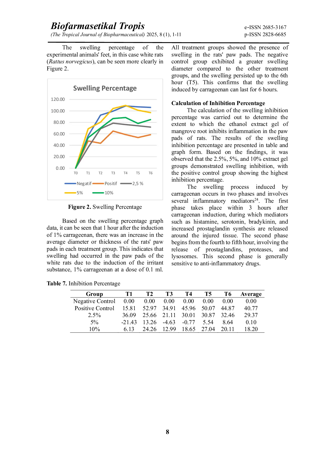 Biofarmasetikal Tropis (The Tropical Journal of Biopharmaceutical)Biofarmasetikal Tropis (The Tropical Journal of Biopharmaceutical)Alam menyediakan berbagai senyawa yang dapat memberikan aktivitas sebagai antiinflamasi, salah satunya adanya senyawa yang terkandung dalam akar mangrove (Sonneratia alba). Dalam tumbuhan tersebut khususnya pada bagian akar terdapat senyawa-senyawa metabolit sekunder jenis alkaloid, flavonoid, tanin, triterpenoid dan dari berbagai hasil penelitian yang dilaporkan, flavonoid memiliki khasiat sebagai antiinflamasi. Sediaan obat yang ingin dibuat oleh peneliti adalah sediaan berbentuk gel yang digunakan untuk terapi pengobatan secara topikal. Penelitian dilakukan dengan 15 ekor tikus yang menjadi 5 kelompok uji. Kelompok kontrol positif : diberikan gel Natrium Diclofenac (Voltadex) 20 g (1%), kelompok kontrol negatif : diberikan gel tanpa ekstrak etanol, kelompok konsentrasi 2,5 % : diberikan gel ekstrak etanol 2,5 %, kelompok konsentrasi 5 % : diberikan gel ekstrak etanol 5 %, kelompok konsentrasi 10 % : diberikan gel ekstrak etanol 10 %. Data dianalisa secara deskriptif yang disajikan dalam bentuk tabel dan grafik. Hasil penelitian menunjukan sediaan gel ekstrak etanol Sonneratia alba memiliki aktivitas sebagai anti-inflamasi. Hasil penelitian menunjukan ekstrak etanol akar mangrove Sonneratia alba bisa dijadikan sediaan gel dan pada pengujiannya secara in vivo sediaan gel ekstrak etanol akar mangrove Sonneratia alba memiliki aktivitas sebagai antiinflamasi. Kelompok kontrol sediaan gel ekstrak etanol akar mangrove Sonneratia alba konsentrasi 2,5 %, 5% dan 10 % memiliki persen inhibisi bengkak yang mana berarti sediaan gel ekstrak etanol akar mangrove Sonneratia alba konsentrasi 2,5 %, 5% dan 10 % memiliki aktivitas antiinflamasi.
