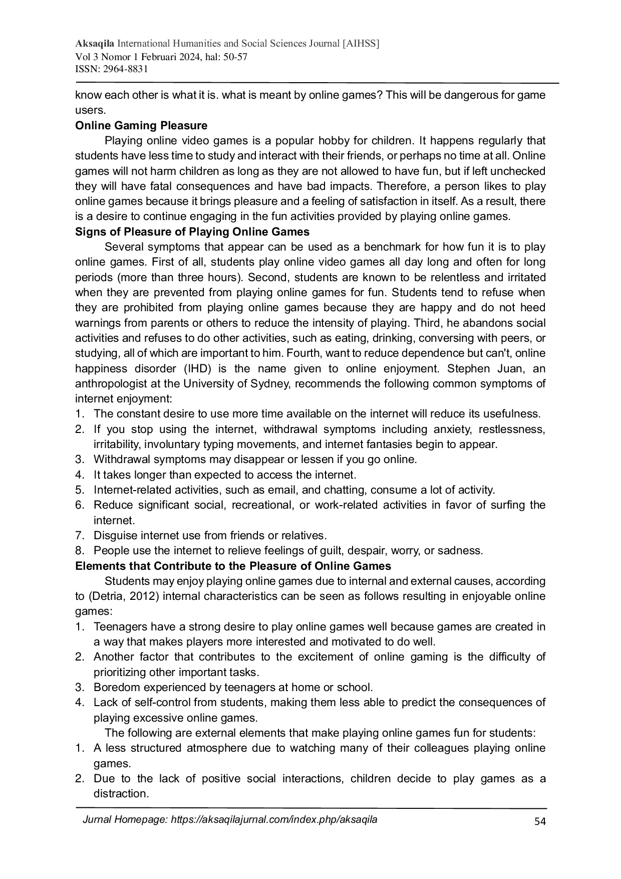 Aksaqila International Humanities and Social Sciences [AIHSS] JournalAksaqila International Humanities and Social Sciences [AIHSS] JournalThis study aims to find out how to overcome the pleasure of playing online games for college students. The research population is all students at private universities in Medan City who like to play online games and the research sample is 75 people. This study uses a qualitative method. Data collection techniques in this study with the questionnaire used. The study results show that playing online games excessively will negatively impact students, disrupting their academic activities both on and off campus. Frequent online gameplay by students can cause problems, especially in their social, educational, and professional lives. More specifically, people who usually attend college spend their time playing online games, which causes their discipline and academic performance to decline. The solution is to offer counseling services that suggest parents can relate to their children more closely, starting to socialize more often. While preventing their children from playing online games, parents are advised to talk to their children, play with them, and maintain a pleasant relationship with them. Students who like to play online games receive special attention from the guidance and counseling campus, which includes the functions of supervision (advocacy) and prevention, understanding, and assistance.