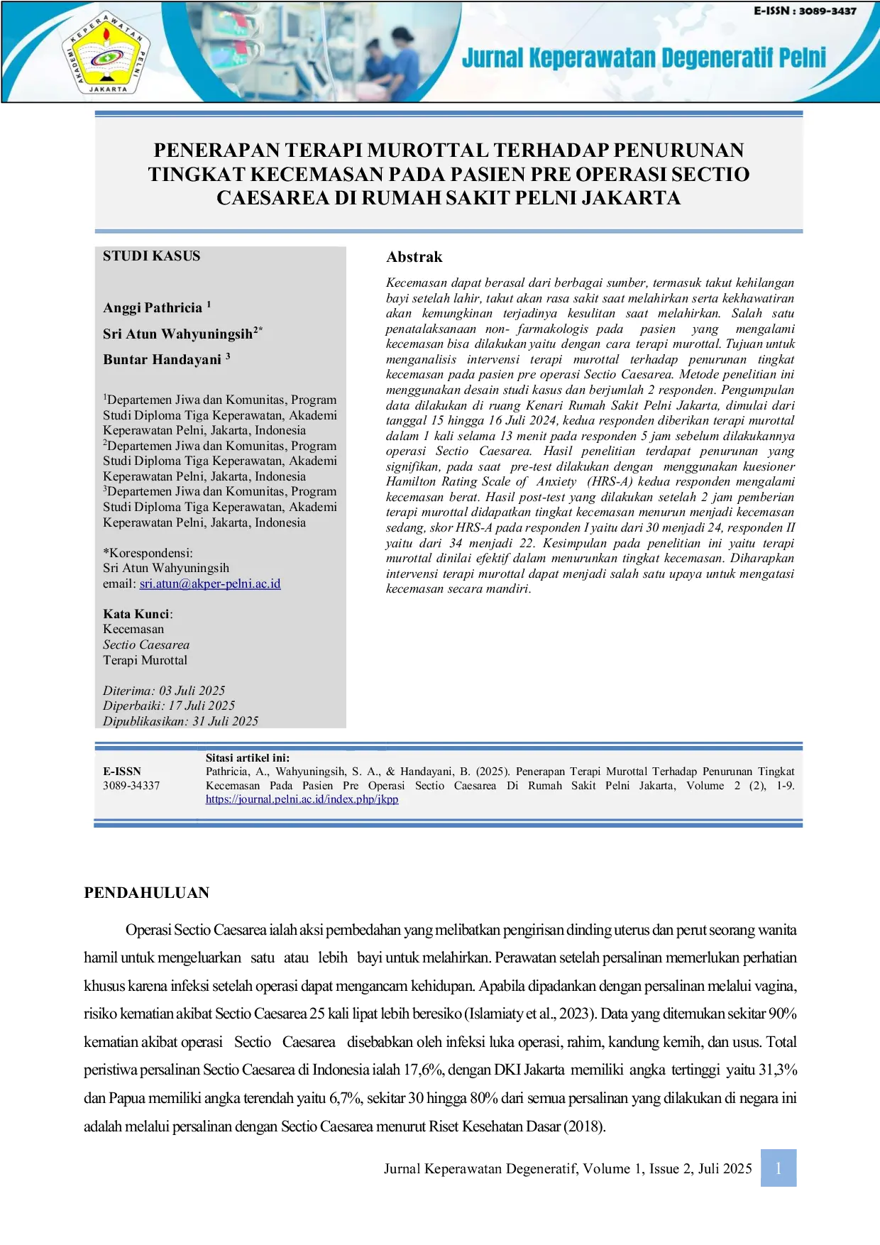 Jurnal Keperawatan Degeneratif PelniJurnal Keperawatan Degeneratif PelniKecemasan dapat berasal dari berbagai sumber, termasuk takut kehilangan bayi setelah lahir, takut akan rasa sakit saat melahirkan serta kekhawatiran akan kemungkinan terjadinya kesulitan saat melahirkan. Salah satu penatalaksanaan non-farmakologis pada pasien yang mengalami kecemasan bisa dilakukan yaitu dengan cara terapi murottal. Tujuan penelitian ini adalah menganalisis tingkat kecemasan pada pasien pre operasi Sectio Caesarea. Metode penelitian ini menggunakan desain studi kasus dan berjumlah 2 responden. Pengumpulan data dilakukan di ruang Kenari Rumah Sakit Pelni Jakarta, dimulai dari tanggal 15 hingga 16 Juli 2024, kedua responden diberikan terapi murottal dalam 1 kali selama 13 menit pada responden 5 jam sebelum dilakukannya operasi Sectio Caesarea. Hasil penelitian terdapat penurunan yang signifikan, pada saat pre-test dilakukan dengan menggunakan kuesioner Hamilton Rating Scale of Anxiety (HRS-A) kedua responden mengalami kecemasan berat. Hasil post-test yang dilakukan setelah 2 jam pemberian terapi murottal didapatkan tingkat kecemasan menurun menjadi kecemasan sedang, skor HRS-A pada responden I yaitu dari 30 menjadi 24, responden II yaitu dari 34 menjadi 22. Kesimpulan pada penelitian ini yaitu terapi murottal dinilai efektif dalam menurunkan tingkat kecemasan. Diharapkan intervensi terapi murottal dapat menjadi salah satu upaya untuk mengatasi kecemasan secara mandiri.