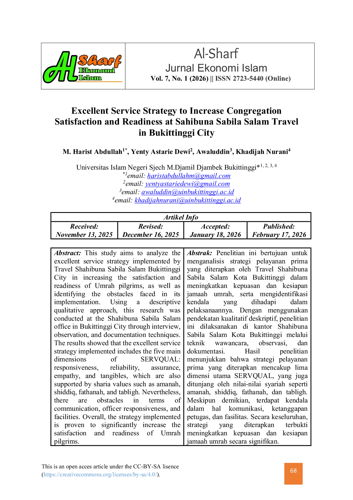 Al-Sharf: Jurnal Ekonomi IslamAl-Sharf: Jurnal Ekonomi IslamPenelitian ini bertujuan untuk menganalisis strategi pelayanan prima yang diterapkan oleh Travel Shahibuna Sabila Salam Kota Bukittinggi dalam meningkatkan kepuasan dan kesiapan jamaah umrah, serta mengidentifikasi kendala yang dihadapi dalam pelaksanaannya. Dengan menggunakan pendekatan kualitatif deskriptif, penelitian ini dilaksanakan di kantor Shahibuna Sabila Salam Kota Bukittinggi melalui teknik wawancara, observasi, dan dokumentasi. Hasil penelitian menunjukkan bahwa strategi pelayanan prima yang diterapkan mencakup lima dimensi utama SERVQUAL, yang juga ditunjang oleh nilai-nilai syariah seperti amanah, shiddiq, fathanah, dan tabligh. Meskipun demikian, terdapat kendala dalam hal komunikasi, ketanggapan petugas, dan fasilitas. Secara keseluruhan, strategi yang diterapkan terbukti meningkatkan kepuasan dan kesiapan jamaah umrah secara signifikan.