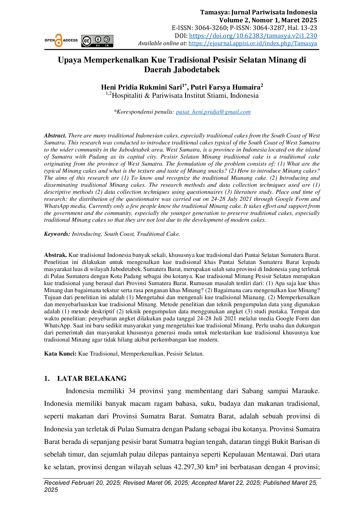 Tamasya : Jurnal Pariwisata IndonesiaTamasya : Jurnal Pariwisata IndonesiaIndonesia memiliki banyak kue tradisional, terutama dari Pantai Selatan Sumatera Barat. Penelitian ini bertujuan mengenalkan kue tradisional khas Pantai Selatan Sumatera Barat kepada masyarakat luas di wilayah Jabodetabek. Kue tradisional Minang Pesisir Selatan merupakan kue tradisional yang berasal dari Provinsi Sumatera Barat. Rumusan masalah terdiri dari: (1) Apa saja kue khas Minang dan bagaimana tekstur serta rasa penganan khas Minang? (2) Bagaimana cara mengenalkan kue Minang? Tujuan dari penelitian ini adalah (1) Mengetahui dan mengenali kue tradisional Mianang. (2) Memperkenalkan dan menyebarluaskan kue tradisional Minang. Metode penelitian dan teknik pengumpulan data yang digunakan adalah (1) metode deskriptif (2) teknik pengumpulan data menggunakan angket (3) studi pustaka. Tempat dan waktu penelitian: penyebaran angket dilakukan pada tanggal 24-28 Juli 2021 melalui media Google Form dan WhatsApp. Saat ini baru sedikit masyarakat yang mengetahui kue tradisional Minang. Perlu usaha dan dukungan dari pemerintah dan masyarakat, terutama generasi muda, untuk melestarikan kue tradisional, terutama kue tradisional Minang agar tidak hilang akibat perkembangan kue modern.
