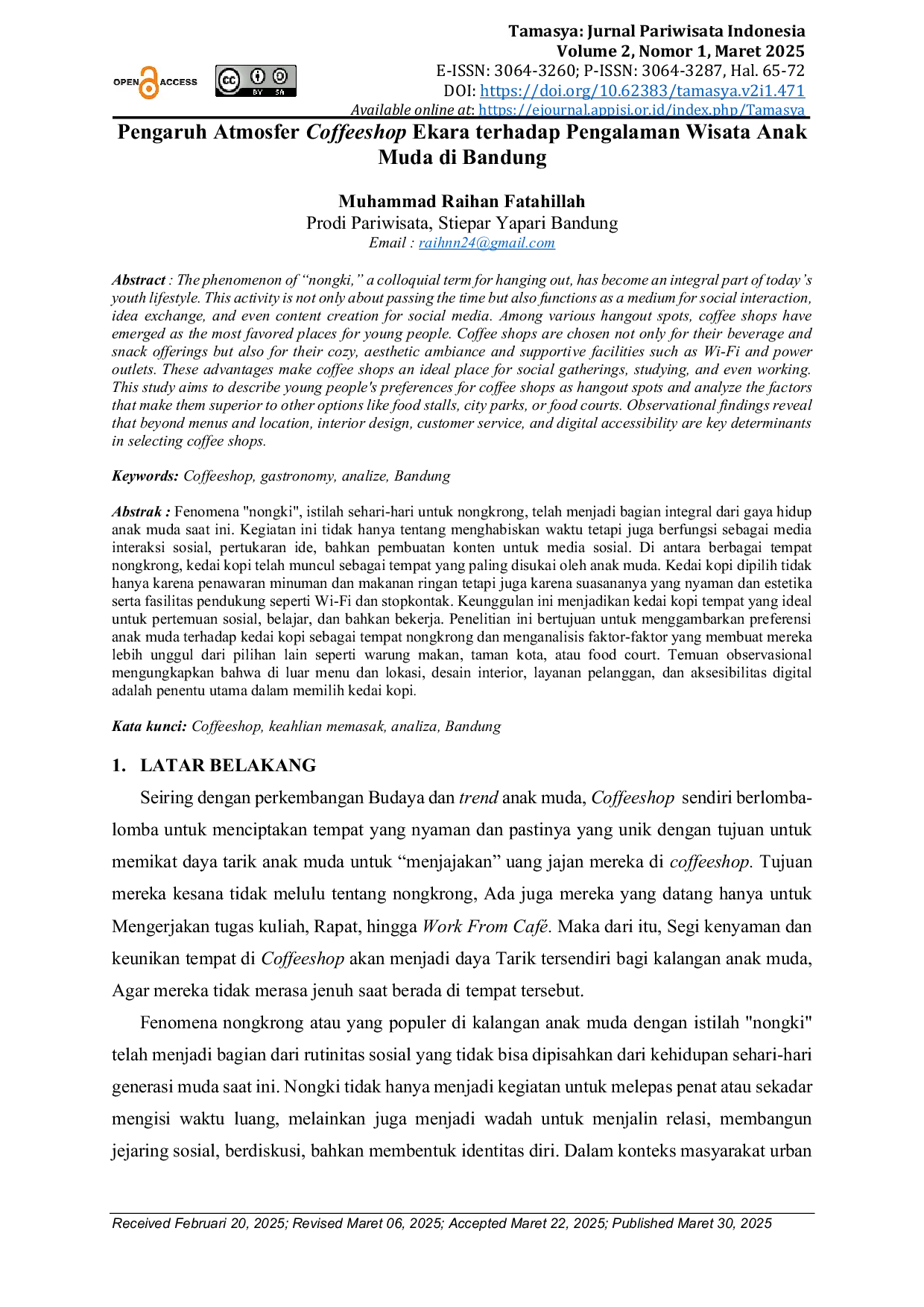 Tamasya : Jurnal Pariwisata IndonesiaTamasya : Jurnal Pariwisata IndonesiaFenomena nongki, istilah sehari-hari untuk nongkrong, telah menjadi bagian integral dari gaya hidup anak muda saat ini. Kegiatan ini tidak hanya tentang menghabiskan waktu tetapi juga berfungsi sebagai media interaksi sosial, pertukaran ide, bahkan pembuatan konten untuk media sosial. Di antara berbagai tempat nongkrong, kedai kopi telah muncul sebagai tempat yang paling disukai oleh anak muda. Kedai kopi dipilih tidak hanya karena penawaran minuman dan makanan ringan tetapi juga karena suasananya yang nyaman dan estetika serta fasilitas pendukung seperti Wi-Fi dan stopkontak. Keunggulan ini menjadikan kedai kopi tempat yang ideal untuk pertemuan sosial, belajar, dan bahkan bekerja. Penelitian ini bertujuan untuk menggambarkan preferensi anak muda terhadap kedai kopi sebagai tempat nongkrong dan menganalisis faktor-faktor yang membuat mereka lebih unggul dari pilihan lain seperti warung makan, taman kota, atau food court. Temuan observasional mengungkapkan bahwa di luar menu dan lokasi, desain interior, layanan pelanggan, dan aksesibilitas digital adalah penentu utama dalam memilih kedai kopi.