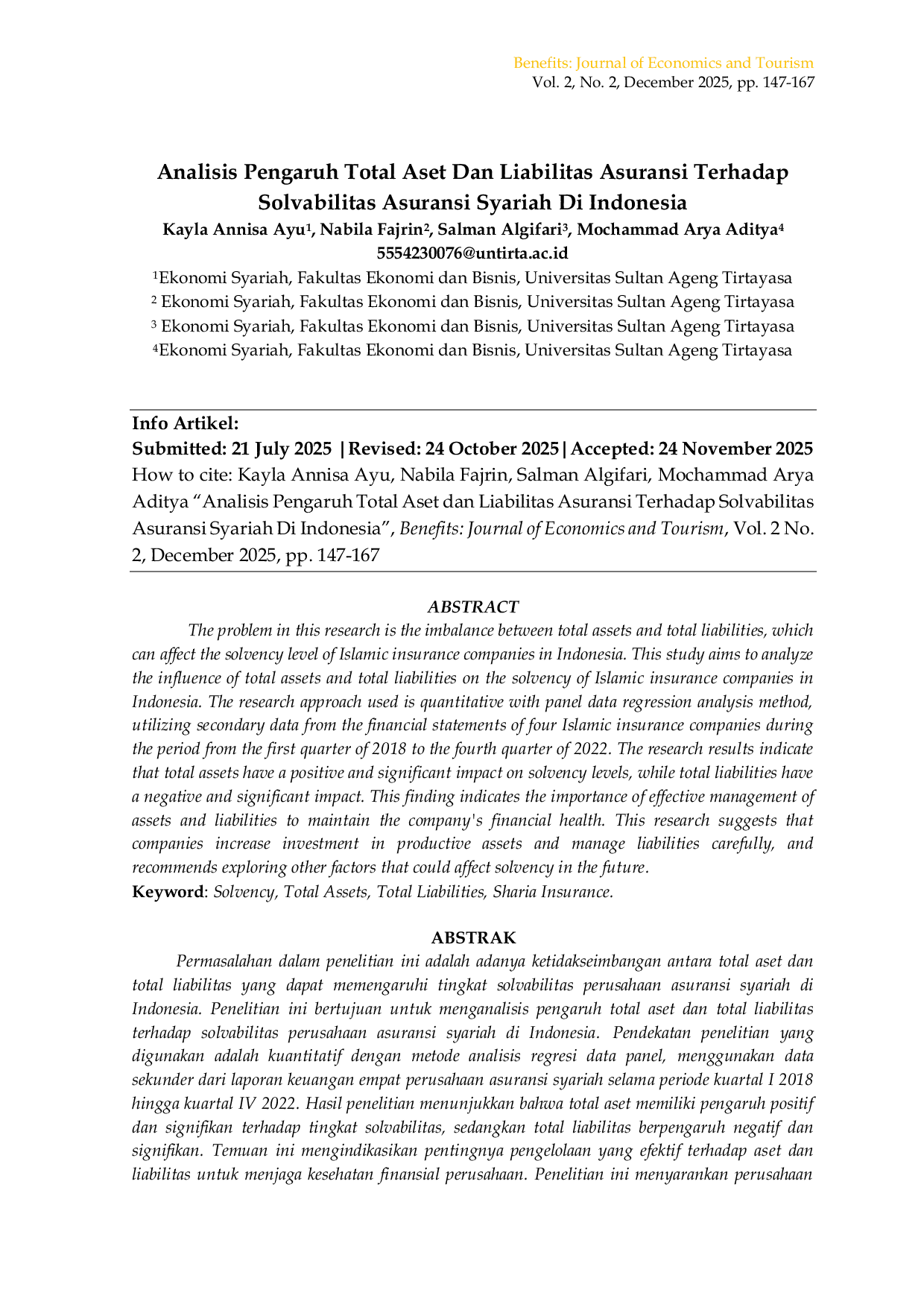 Benefits: Journal of Economics and TourismBenefits: Journal of Economics and TourismPermasalahan dalam penelitian ini adalah adanya ketidakseimbangan antara total aset dan total liabilitas yang dapat memengaruhi tingkat solvabilitas perusahaan asuransi syariah di Indonesia. Penelitian ini bertujuan untuk menganalisis pengaruh total aset dan total liabilitas terhadap solvabilitas perusahaan asuransi syariah di Indonesia. Pendekatan penelitian yang digunakan adalah kuantitatif dengan metode analisis regresi data panel, menggunakan data sekunder dari laporan keuangan empat perusahaan asuransi syariah selama periode kuartal I 2018 hingga kuartal IV 2022. Hasil penelitian menunjukkan bahwa total aset memiliki pengaruh positif dan signifikan terhadap tingkat solvabilitas, sedangkan total liabilitas berpengaruh negatif dan signifikan. Temuan ini mengindikasikan pentingnya pengelolaan yang efektif terhadap aset dan liabilitas untuk menjaga kesehatan finansial perusahaan. Penelitian ini menyarankan perusahaan untuk meningkatkan investasi pada aset produktif dan mengelola liabilitas dengan hati-hati, serta merekomendasikan eksplorasi faktor-faktor lain yang dapat mempengaruhi solvabilitas di masa mendatang.