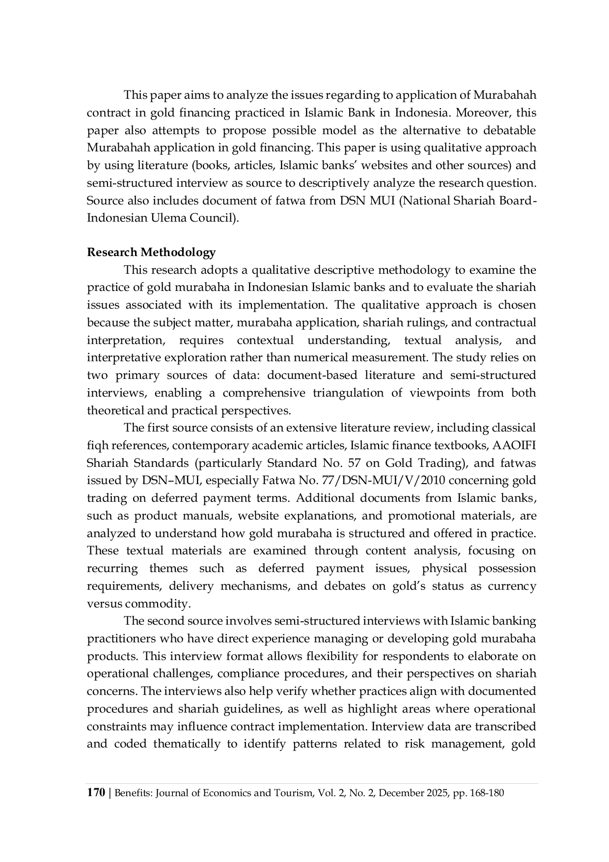 Benefits: Journal of Economics and TourismBenefits: Journal of Economics and TourismEmas dianggap sebagai salah satu logam paling berharga di dunia karena tren harganya yang terus meningkat. Alasan ini mendorong orang untuk berinvestasi dalam emas. Di Indonesia, beberapa bank Islam dan platform digital menawarkan produk yang terkait dengan jenis investasi ini berdasarkan kontrak murabahah dengan dasar pembayaran yang ditangguhkan atau angsuran. Studi ini mengkaji penerapan kontrak murābaḥa dalam pembiayaan emas yang ditawarkan oleh bank-bank Islam Indonesia. Penelitian ini bertujuan untuk mengidentifikasi masalah kepatuhan Syariah, khususnya yang menyangkut pembayaran yang ditangguhkan dan kepemilikan fisik, dan untuk mengusulkan model-model alternatif yang lebih selaras dengan prinsip-prinsip hukum Islam. Studi ini menggunakan pendekatan kualitatif, menggabungkan analisis doktrinal dari sumber-sumber Al-Quran dan Hadits, fatwa yang dikeluarkan oleh DSN-MUI, dan pedoman peraturan dengan tinjauan literatur kontemporer tentang keuangan Islam. Data dikumpulkan dari situs web resmi bank-bank Islam dan dokumen produk, yang memungkinkan untuk membandingkan praktik Murabahah Emas di beberapa lembaga. Dua masalah utama diidentifikasi dalam praktik saat ini: (1) penggunaan pembayaran yang ditangguhkan (angsuran) dalam pertukaran emas, yang bertentangan dengan persyaratan hadits penyelesaian spot; dan (2) pertanyaan mengenai kepemilikan fisik dan penyerahan emas, yang menimbulkan kekhawatiran tentang pengalihan kepemilikan dan larangan riba al-nasīʾah. Penelitian ini juga mengusulkan sebuah model sebagai alternatif.