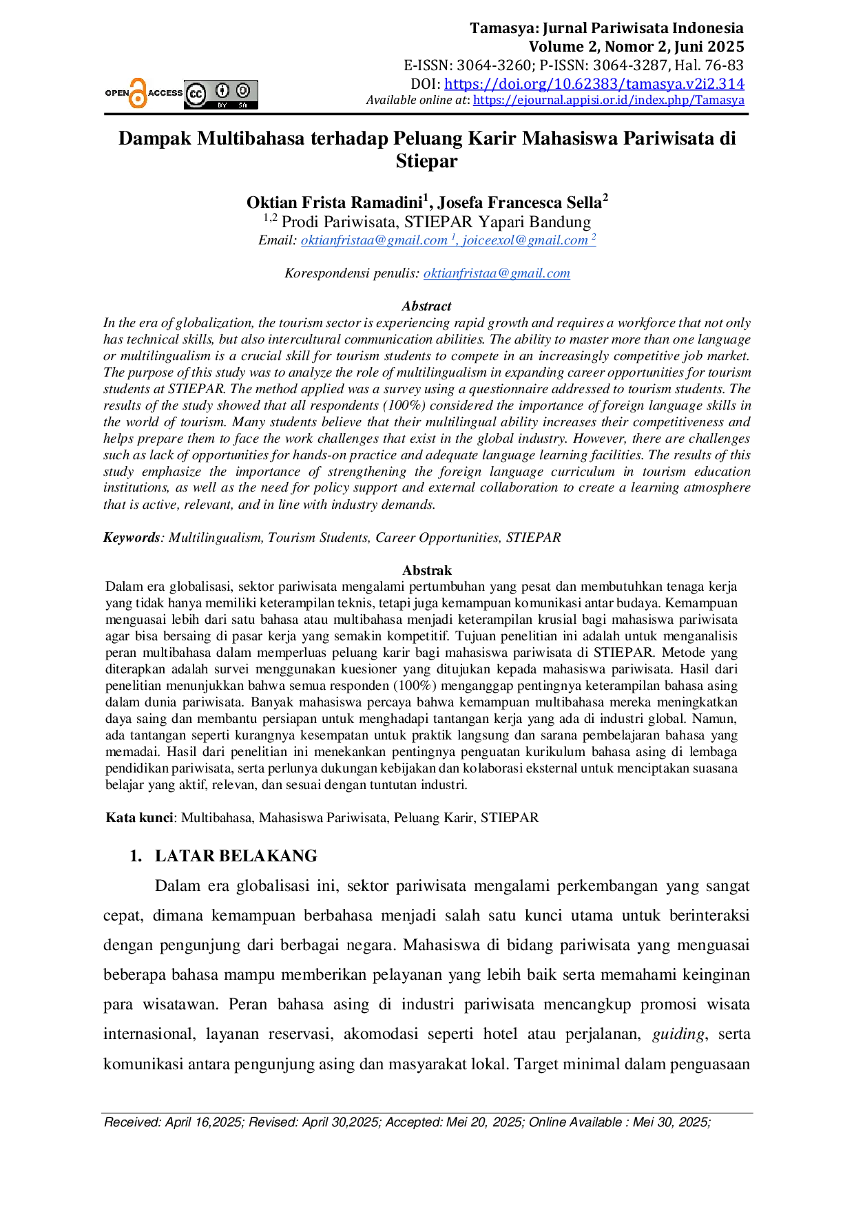 Tamasya : Jurnal Pariwisata IndonesiaTamasya : Jurnal Pariwisata IndonesiaDalam era globalisasi, sektor pariwisata mengalami pertumbuhan yang pesat dan membutuhkan tenaga kerja yang tidak hanya memiliki keterampilan teknis, tetapi juga kemampuan komunikasi antar budaya. Kemampuan menguasai lebih dari satu bahasa atau multibahasa menjadi keterampilan krusial bagi mahasiswa pariwisata agar bisa bersaing di pasar kerja yang semakin kompetitif. Tujuan penelitian ini adalah untuk menganalisis peran multibahasa dalam memperluas peluang karir bagi mahasiswa pariwisata di STIEPAR. Metode yang diterapkan adalah survei menggunakan kuesioner yang ditujukan kepada mahasiswa pariwisata. Hasil dari penelitian menunjukkan bahwa semua responden (100%) menganggap pentingnya keterampilan bahasa asing dalam dunia pariwisata. Banyak mahasiswa percaya bahwa kemampuan multibahasa mereka meningkatkan daya saing dan membantu persiapan untuk menghadapi tantangan kerja yang ada di industri global. Namun, ada tantangan seperti kurangnya kesempatan untuk praktik langsung dan sarana pembelajaran bahasa yang memadai. Hasil dari penelitian ini menekankan pentingnya penguatan kurikulum bahasa asing di lembaga pendidikan pariwisata, serta perlunya dukungan kebijakan dan kolaborasi eksternal untuk menciptakan suasana belajar yang aktif, relevan, dan sesuai dengan tuntutan industri.
