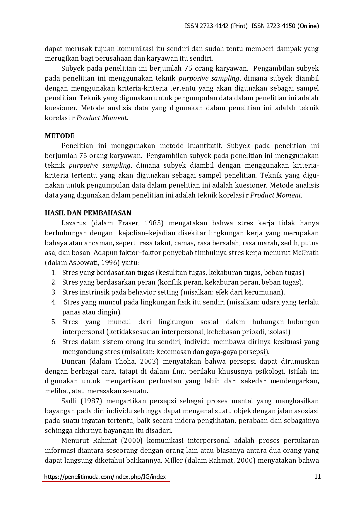 ISLAMIKA GRANADAISLAMIKA GRANADAStres kerja adalah kondisi yang memengaruhi staf baik secara fisik maupun psikologis karena ketidakcocokan antara tugas yang diberikan dengan kemampuan karyawan. Stres tersebut dipengaruhi oleh faktor sosial, terutama dalam hubungan interpersonal (interpersonal mismatch, personal freedom, isolation), sehingga penelitian ini bertujuan melihat hubungan antara persepsi komunikasi interpersonal dengan tekanan kerja pada karyawan PT. Wesen Jayatama Cabang Medan. Sampel penelitian terdiri atas 75 karyawan; hipotesisnya menyatakan adanya hubungan antara persepsi komunikasi interpersonal dengan stres kerja, dengan asumsi peningkatan komunikasi interpersonal akan menurunkan stres, sedangkan persepsi yang buruk akan meningkatkan stres. Data dikumpulkan memakai skala Likert dan teknik purposive sampling, serta diuji menggunakan teknik analisis produk Karl. Hasil analisis menunjukkan adanya hubungan signifikan antara persepsi komunikasi interpersonal dengan tekanan kerja pada karyawan.