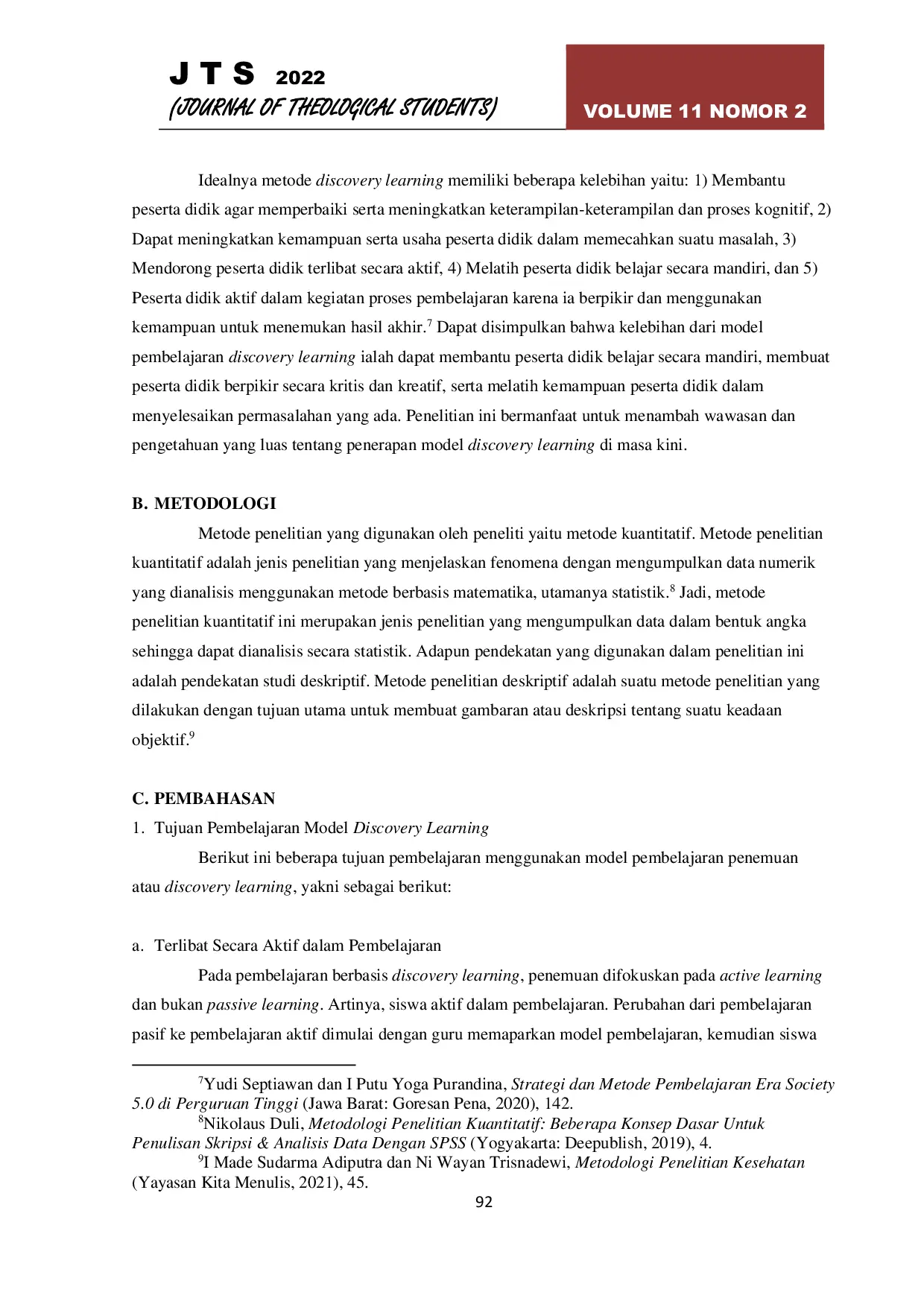 Jurnal of Theological Students, jurnal teologi, jurnal pendidikaJurnal of Theological Students, jurnal teologi, jurnal pendidikaThere is an allegation that the discovery learning model in faith lessons at the sixth grade in Daniel Creative School Semarang has not been maximized. This is because most students are still unable to solve existing problems, are less actively involved and open themselves to new things that were not known before. This study aims to determine the effectiveness of the discovery learning model in learning faith (Christian religion lessons) during the pandemic. The methodology used is descriptive quantitative. Based on the hypothesis test, it was found that the level of effectiveness of the discovery learning model in faith lessons at the sixth grade in Daniel Creative School Semarang was in the good category, namely 79.3%.