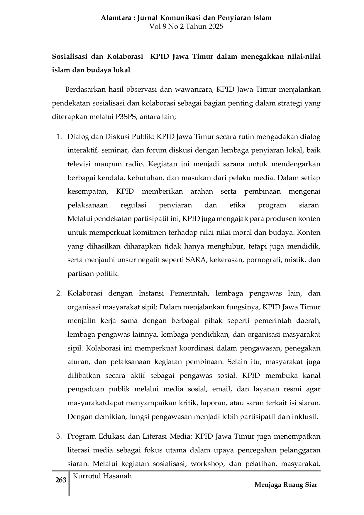 Alamtara: Jurnal Komunikasi dan Penyiaran IslamAlamtara: Jurnal Komunikasi dan Penyiaran IslamKomisi Penyiaran Indonesia Daerah (KPID) Jawa Timur merupakan lembaga independen yang berperan penting dalam memastikan lembaga penyiaran tetap berpedoman pada Pedoman Perilaku Penyiaran dan Standar Program Siaran (P3SPS). Penelitian ini bertujuan menjelaskan strategi KPID Jawa Timur dalam menjaga ruang siar publik agar selaras dengan nilai-nilai Islam dan budaya lokal melalui penerapan prinsip P3SPS. Pendekatan yang digunakan ialah deskriptif kualitatif dengan teknik wawancara mendalam, observasi, dan dokumentasi terhadap aktivitas pengawasan KPID Jawa Timur. Hasil penelitian menunjukkan bahwa strategi pengawasan KPID Jawa Timur menerapkan pola manajemen mutu PDCA (Plan–Do–Check–Act) yang diintegrasikan dengan prinsip etika Islam dan kearifan budaya lokal. Strategi ini memungkinkan proses pengawasan berjalan sistematis, adaptif terhadap perkembangan media digital, serta berorientasi pada moralitas publik. Nilai Islam seperti keadilan, kesopanan, dan tanggung jawab sosial menjadi dasar dalam penyusunan kebijakan, sedangkan nilai budaya lokal diwujudkan dalam upaya pelestarian bahasa daerah, kesenian, dan tata krama masyarakat Jawa Timur. Kendala utama yang dihadapi adalah keterbatasan sumber daya manusia serta belum efektifnya regulasi sanksi administratif. Penelitian ini menegaskan pentingnya integrasi nilai religius dan kultural dalam sistem pengawasan penyiaran sebagai upaya menjaga ruang siar publik yang sehat dan beradab.