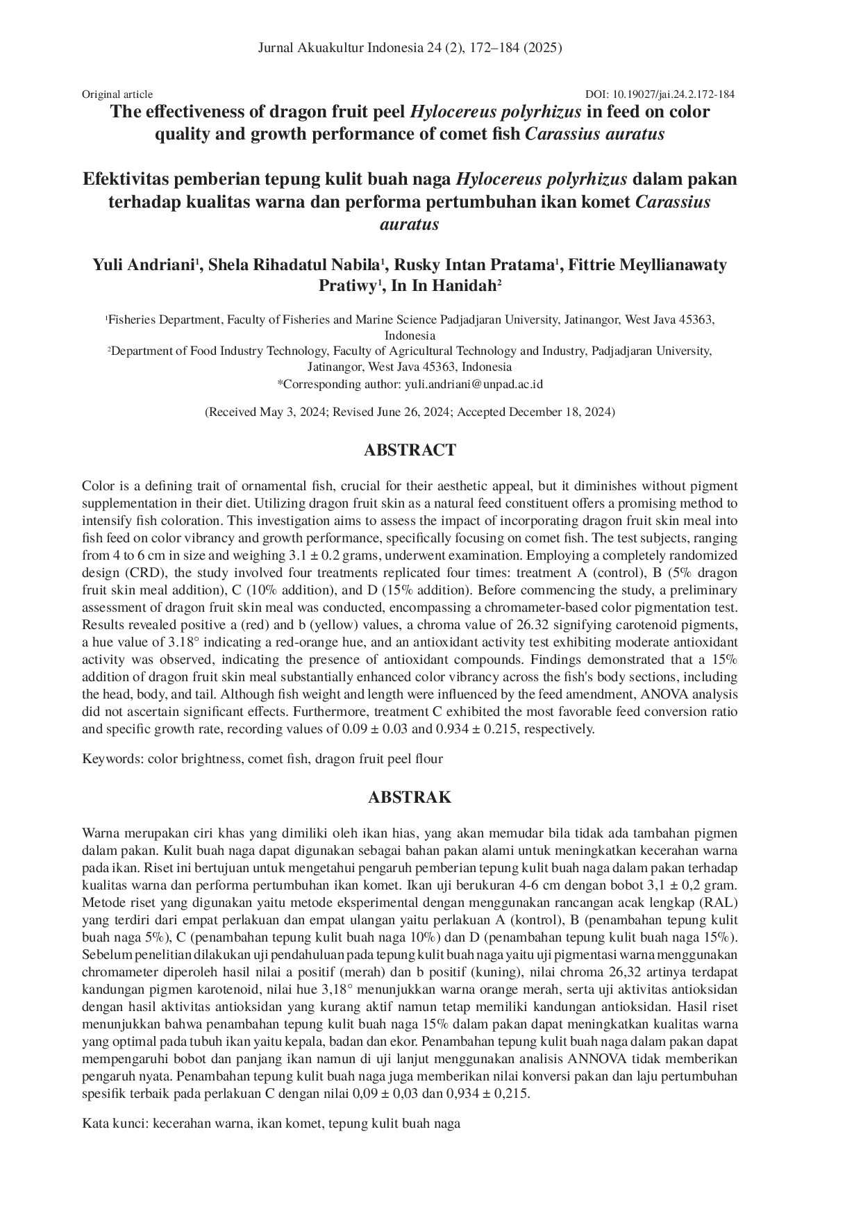 Jurnal Akuakultur IndonesiaJurnal Akuakultur IndonesiaColor is a defining trait of ornamental fish, crucial for their aesthetic appeal, but it diminishes without pigment supplementation in their diet. Utilizing dragon fruit skin as a natural feed constituent offers a promising method to intensify fish coloration. This investigation aims to assess the impact of incorporating dragon fruit skin meal into fish feed on color vibrancy and growth performance, specifically focusing on comet fish. The test subjects, ranging from 4 to 6 cm in size and weighing 3.1 ± 0.2 grams, underwent examination. Employing a completely randomized design (CRD), the study involved four treatments replicated four times: treatment A (control), B (5% dragon fruit skin meal addition), C (10% addition), and D (15% addition). Before commencing the study, a preliminary assessment of dragon fruit skin meal was conducted, encompassing a chromameter-based color pigmentation test. Results revealed positive a (red) and b (yellow) values, a chroma value of 26.32 signifying carotenoid pigments, a hue value of 3.18° indicating a red-orange hue, and an antioxidant activity test exhibiting moderate antioxidant activity was observed, indicating the presence of antioxidant compounds. Findings demonstrated that a 15% addition of dragon fruit skin meal substantially enhanced color vibrancy across the fishs body sections, including the head, body, and tail. Although fish weight and length were influenced by the feed amendment, ANOVA analysis did not ascertain significant effects. Furthermore, treatment C exhibited the most favorable feed conversion ratio and specific growth rate, recording values of 0.09 ± 0.03 and 0.934 ± 0.215, respectively.
