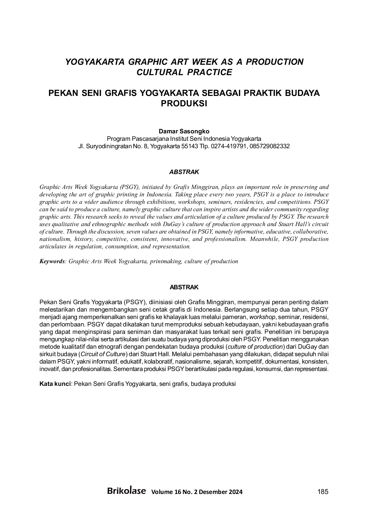 Brikolase : Jurnal Kajian Teori, Praktik dan Wacana Seni Budaya RupaBrikolase : Jurnal Kajian Teori, Praktik dan Wacana Seni Budaya RupaPekan Seni Grafis Yogyakarta (PSGY), diinisiasi oleh Grafis Minggiran, mempunyai peran penting dalam melestarikan dan mengembangkan seni cetak grafis di Indonesia. Berlangsung setiap dua tahun, PSGY menjadi ajang memperkenalkan seni grafis ke khalayak luas melalui pameran, workshop, seminar, residensi, dan perlombaan. PSGY dapat dikatakan turut memproduksi sebuah kebudayaan, yakni kebudayaan grafis yang dapat menginspirasi para seniman dan masyarakat luas terkait seni grafis. Penelitian ini berupaya mengungkap nilai-nilai serta artikulasi dari suatu budaya yang diproduksi oleh PSGY. Penelitian menggunakan metode kualitatif dan etnografi dengan pendekatan budaya produksi (culture of production) dari DuGay dan sirkuit budaya (Circuit of Culture) dari Stuart Hall. Melalui pembahasan yang dilakukan, didapat sepuluh nilai dalam PSGY, yakni informatif, edukatif, kolaboratif, nasionalisme, sejarah, kompetitif, dokumentasi, konsisten, inovatif, dan profesionalitas. Sementara produksi PSGY berartikulasi pada regulasi, konsumsi, dan representasi.