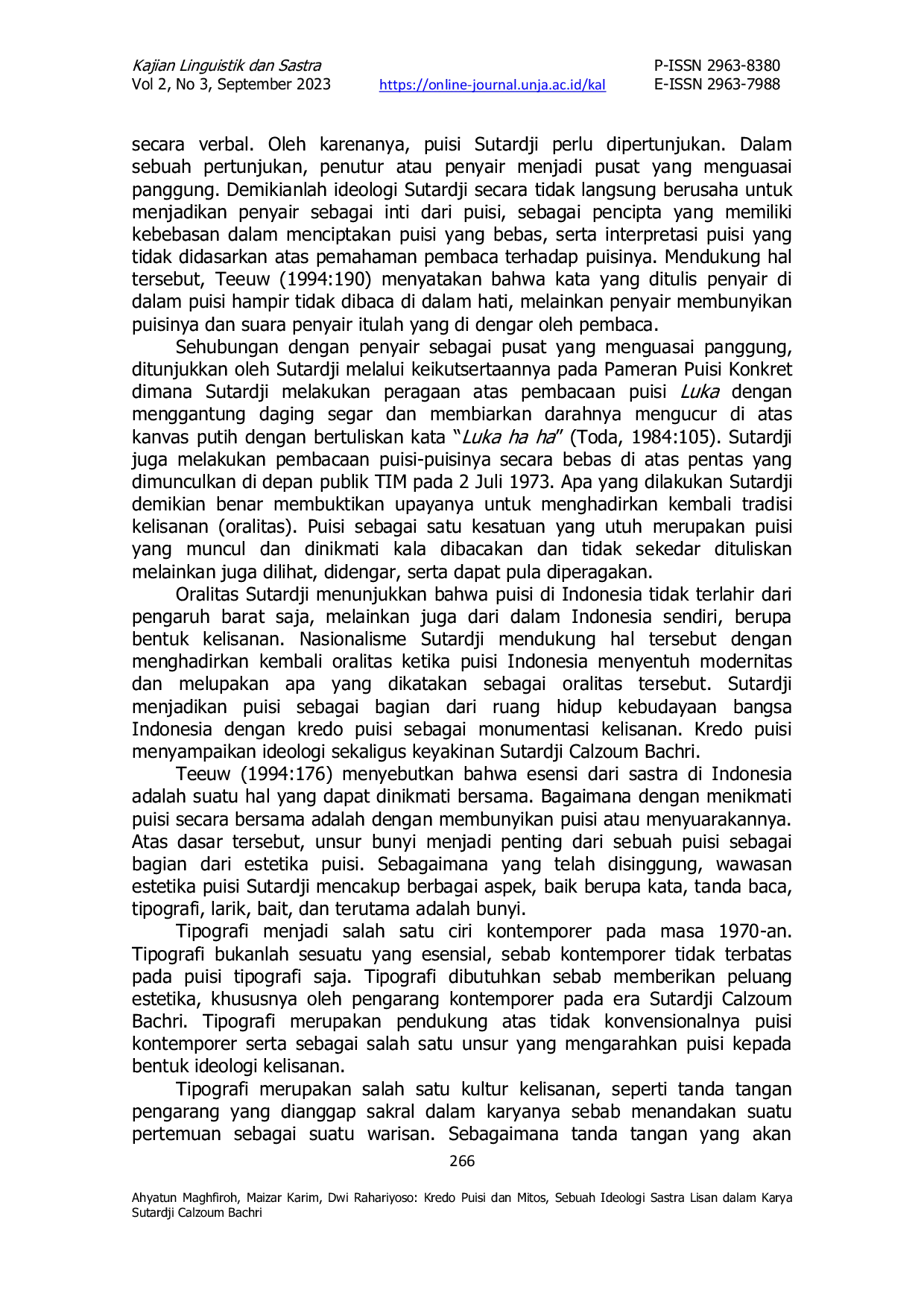 Kajian Linguistik dan SastraKajian Linguistik dan SastraPenelitian ini bertujuan untuk mengetahui bagaimana ideologi sastra lisan dalam kredo puisi menjadi model penciptaan puisi yang dimitoskan dalam karya Sutardji Calzoum Bachri. Metode yang digunakan dalam penelitian ini adalah metode penelitian kualitatif. Data penelitian ini berupa kredo puisi dengan sumber data berupa buku antologi puisi O Amuk Kapak karya Sutardji Calzoum Bachri. Teknik pengumpulan data yang digunakan, yaitu teknik dokumentasi. Adapun teknik analisis yang digunakan, yaitu teknik analisis naratif. Penelitian ini akan menguraikan kredo puisi dalam sistem penandaan mitos Roland Barthes, genealogi estetika berpuisi Sutardji, tipografi sebagai corak kelisanan Sutardji, serta perbandingan antara mantra dengan puisi mantra Sutardji. Penyimpangan yang dilakukan Sutardji untuk menghadirkan mitos dalam penciptaan puisi melalui kredo puisi didasarkan pada tiga aspek, yaitu membebaskan kata dari jajahan makna, membebaskan kata dari jajahan gramatika, dan mengembalikan kata kepada mantra. Ketiga aspek tersebut yang mengarahkan bentuk ideologi menulis puisi Sutardji kepada bentuk ideologi oralitas (kelisanan).