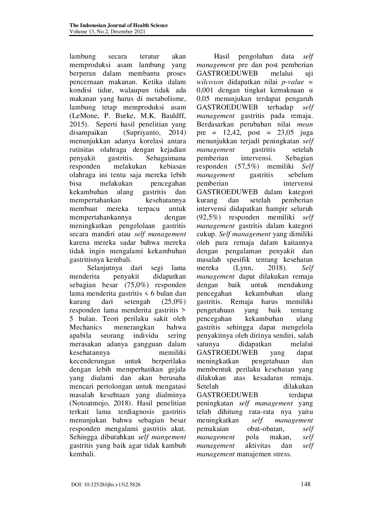 The Indonesian Journal of Health ScienceThe Indonesian Journal of Health ScienceLatar Belakang dan Tujuan: Gastritis merupakan salah satu jenis keluhan sistem pencernaan yang sering dialami remaja dengan tingkat kekambuhan yang tinggi. Angka kejadian kekambuhan penyakit gastritis pada remaja cenderung meningkat karena kurangnya self management yang kurang optimal. Media penyampaian edukasi kesehatan berbasis web yang dikemas dalam bentuk GASTROEDUWEB pada sasaran remaja dapat menjadi solusi alternatif dalam meningkatkan pengetahuan. Penelitian ini bertujuan mengetahui pengaruh GASTROEDUWEB terhadap self management gastritis pada remaja.