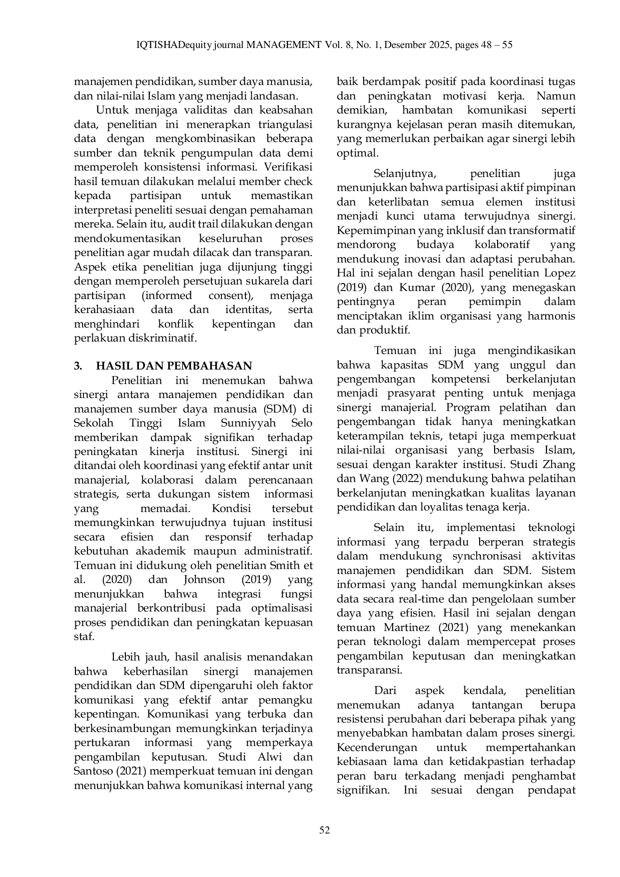IQTISHADequity jurnal MANAJEMENIQTISHADequity jurnal MANAJEMENPenelitian ini mengkaji sinergi antara manajemen pendidikan dan manajemen sumber daya manusia di Sekolah Tinggi Islam Sunniyyah Selo dengan pendekatan kualitatif deskriptif eksploratif. Fokus utama penelitian adalah bagaimana sinergi tersebut mampu meningkatkan efektivitas pengelolaan beban kerja dan kualitas layanan pendidikan. Data dikumpulkan melalui observasi partisipatif, wawancara mendalam, dan dokumentasi, kemudian dianalisis secara tematik. Hasil penelitian menegaskan peran penting kepemimpinan transformasional, sistem penghargaan yang transparan, komunikasi internal yang efektif, serta budaya organisasi yang adaptif berbasis nilai-nilai Islam. Sinergi ini juga membuka peluang inovasi pengembangan kurikulum dan peningkatan karier dosen yang berkontribusi pada daya saing institusi. Implikasi manajerialnya adalah perlunya evaluasi dan penyempurnaan mekanisme sinergi secara berkelanjutan dengan keterlibatan seluruh pemangku kepentingan. Penelitian ini memberikan kontribusi teoritik dan praktis dalam pengembangan manajemen pendidikan tinggi berbasis nilai Islam.