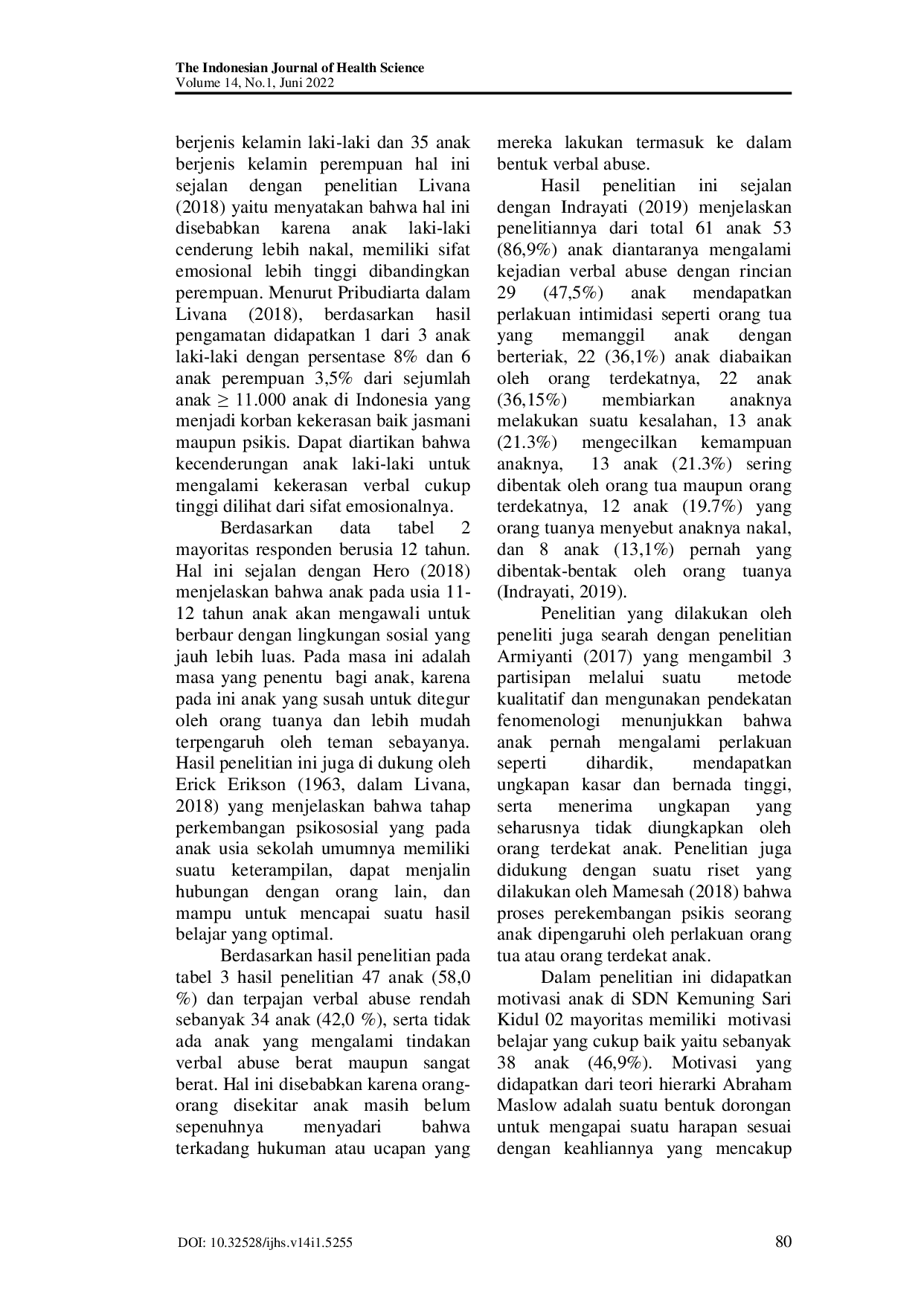 The Indonesian Journal of Health ScienceThe Indonesian Journal of Health ScienceLatar belakang dan tujuan: Verbal abuse salah satu bentuk tindakan kekerasan berupa ucapan dimana dapat menimbulkan kondisi emosional yang merugikan dan berpengaruh terhadap perkembangan kognitif anak. Kejadian verbal abuse yang dilakukan terus menerus dapat menggangu proses perkembangan otak yang sedang berkembang. Penelitian ini bermaksud untuk melihat adanya di SDN Kemuning Sari Kidul 02 Kecamatan Jenggawah Kabupaten Jember. Metode: Desain penelitian memakai desain korelasional melalui suatu model cross sectional. Populasi yang digunakan oleh peneliti sebanyak 101 anak dengan sample penelitian 81 anak menggunakan teknik propotional stratified random sampling. Analisis bivariat mengunakan uji korelasi Spearman Rank. Hasil: Hasil penelitian yang diperoleh p value 0,0005<α 0,05 dengan korelasi 0,434 yang berarti penelitian memiliki hubungan sedang antara verbal abuse dengan motivasi belajar anak. Simpulan dan Implikasi: Peran perawat dapat menjadi konselor dan edukator terkait pemahaman terhadap bentuk verbal abuse hingga pencegahan kejadian verbal abuse sehingga diharapkan seorang anak mencapai tahapan perkembangan yang sesuai dengan usianya.