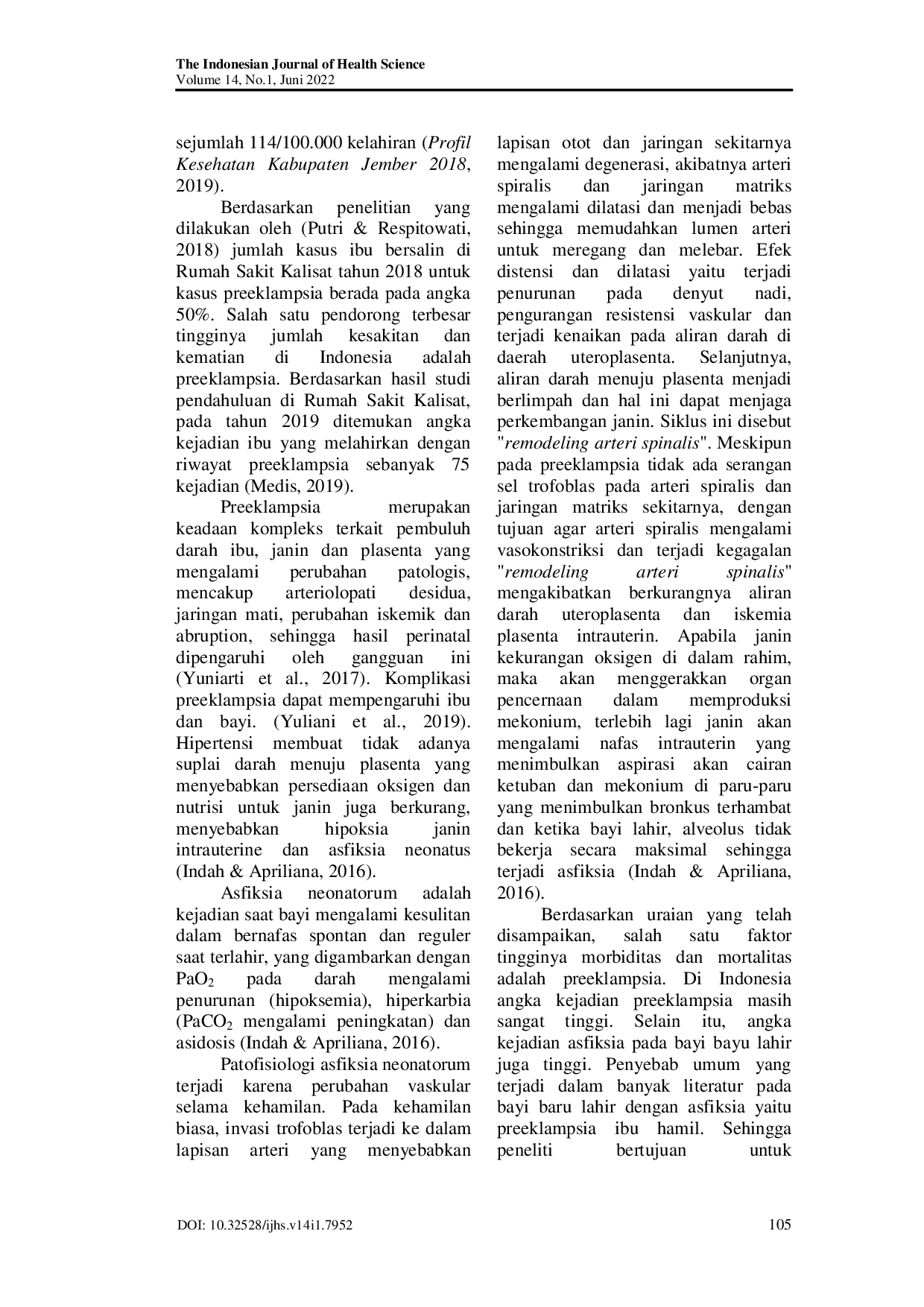 The Indonesian Journal of Health ScienceThe Indonesian Journal of Health ScienceKompleksitas preeklampsia dapat mempengaruhi ibu dan janin. Pada ibu hamil dengan preeklampsia terjadi peningkatan pergerakan sel trofoblas yang menyebabkan gangguan aliran darah melewati arteri dan mengakibatkan iskemia plasenta. Berkurangnya suplai darah ke plasenta pada ibu hamil dengan preeklampsia akan menyebabkan terganggunya aliran nutrisi, karbondioksida, dan oksigen yang menyebabkan asfiksia. Penelitian ini menganjurkan lebih gencarnya upaya untuk pemeriksaan antenatal care dan skrining atau deteksi dini preeklampsia untuk menghindari asfiksia.