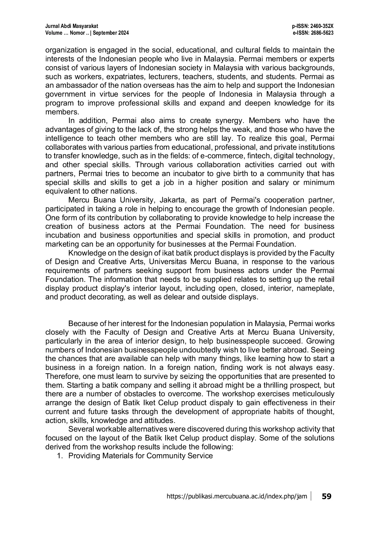 Jurnal Abdi Masyarakat (JAM)Jurnal Abdi Masyarakat (JAM)Workshop untuk Permai business actors di Penang, Malaysia, mengenai penataan produk Batik Iket Celup. Tujuan workshop ini adalah untuk mendukung inisiatif pengembangan bisnis produksi batik tradisional, khususnya terkait Batik Iket. Konfigurasi tata letak ini, termasuk tampilan terbuka, tertutup, interior, nameplate, dan dekorasi produk, serta tampilan dealer dan eksternal, memungkinkan tampilan interior produk Batik Iket. Peningkatan kapasitas pelaku bisnis dalam merancang Batik dicapai melalui metode workshop yang menekankan kerjasama dan konsultasi. Workshop ini diharapkan menghasilkan proses yang membantu pelaku bisnis menjadi lebih efisien dalam pekerjaan mereka saat ini dan di masa depan dengan mengembangkan kebiasaan berpikir, tindakan, keterampilan, pengetahuan, dan sikap yang tepat. Hasil dari PKM ini akan memberikan wawasan ilmiah baik presentasi maupun pelatihan tentang proses pembuatan Batik Iket yang diwarnai.
