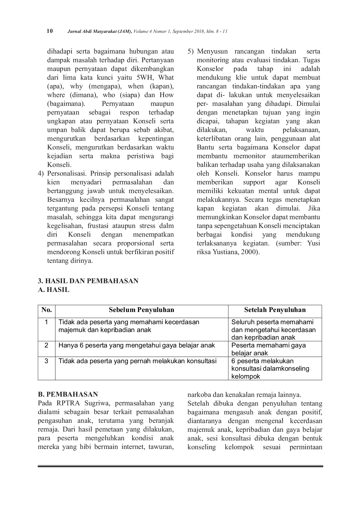 Jurnal Abdi Masyarakat (JAM)Jurnal Abdi Masyarakat (JAM)Ruang Publik Terpadu Ramah Anak (RPTRA) adalah konsep ruang publik berupa ruang terbuka hijau atau taman yang dilengkapi dengan berbagai permainan menarik, pengawasan CCTV, dan ruangan-ruangan yang melayani kepentingan komunitas di sekitar RPTRA. RPTRA dibangun di tengah pemukiman warga, terutama lapisan bawah dan padat penduduk, sehingga manfaatnya dapat dirasakan oleh warga sekitar. Kegiatan ini bertujuan menyediakan psikolog dan peer konselor untuk membantu masyarakat sekitar RPTRA Rawa Buaya memahami persoalan yang mereka hadapi dan mengelola persoalan tersebut dengan lebih efektif. Permasalahan yang dialami sebagian besar terkait pemasalahan pengasuhan anak, terutama yang beranjak remaja. Hasil pemetaan menunjukkan peserta mengeluhkan kondisi anak mereka yang terlibat bermain internet, tawuran, narkoba, dan kenakalan remaja lainnya. Konseling kelompok diselenggarakan setelah penyuluhan tentang pengasuhan anak secara positif, dengan mengenali kecerdasan majemuk, kepribadian, dan gaya belajar anak.