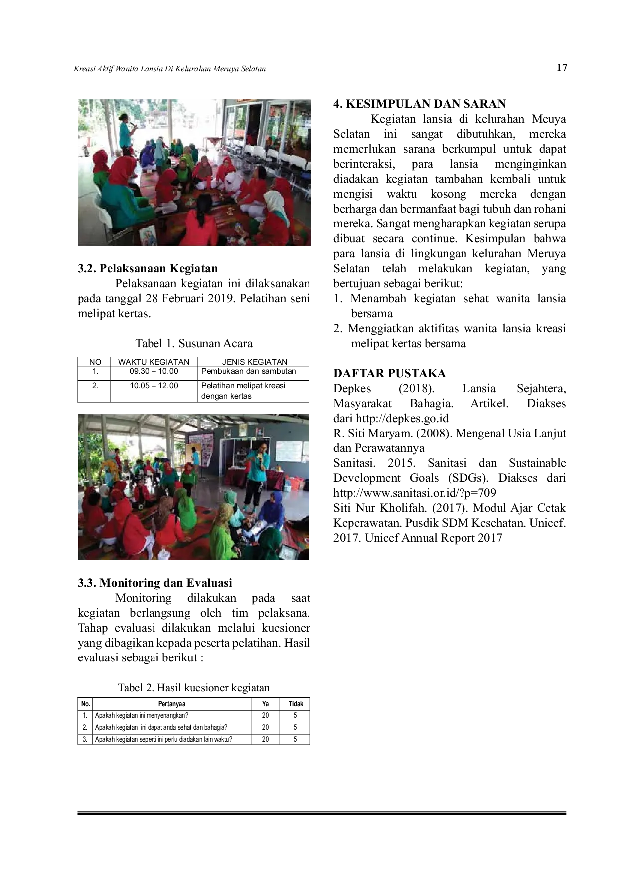 Kegiatan lansia di kelurahan Meuya Selatan ini sangat dibutuhkan, mereka memerlukan sarana berkumpul untuk dapat berinteraksi, para lansia menginginkan diadakan kegiatan tambahan kembali untuk mengisi waktu kosong mereka dengan berharga dan bermanfaat bagi tubuh dan rohani mereka.Sangat mengharapkan kegiatan serupa dibuat secara continue.Kesimpulan bahwa para lansia di lingkungan kelurahan Meruya Selatan telah melakukan kegiatan, yang bertujuan sebagai berikut.Menambah kegiatan sehat wanita lansia bersama 2.Menggiatkan aktifitas wanita lansia kreasi dengan melipat kertas.