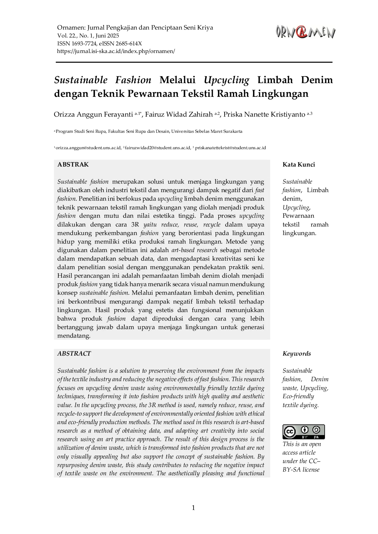 OrnamenOrnamenSustainable fashion merupakan solusi untuk menjaga lingkungan yang diakibatkan oleh industri tekstil dan mengurangi dampak negatif dari fast fashion. Penelitian ini berfokus pada upcycling limbah denim menggunakan teknik pewarnaan tekstil ramah lingkungan yang diolah menjadi produk fashion dengan mutu dan nilai estetika tinggi. Pada proses upcycling dilakukan dengan cara 3R yaitu reduce, reuse, recycle dalam upaya mendukung perkembangan fashion yang berorientasi pada lingkungan hidup yang memiliki etika produksi ramah lingkungan. Metode yang digunakan dalam penelitian ini adalah art-based research sebagai metode dalam mendapatkan sebuah data, dan mengadaptasi kreativitas seni ke dalam penelitian sosial dengan menggunakan pendekatan praktik seni. Hasil perancangan ini adalah pemanfaatan limbah denim diolah menjadi produk fashion yang tidak hanya menarik secara visual namun mendukung konsep sustainable fashion. Melalui pemanfaatan limbah denim, penelitian ini berkontribusi mengurangi dampak negatif limbah tekstil terhadap lingkungan. Hasil produk yang estetis dan fungsional menunjukkan bahwa produk fashion dapat diproduksi dengan cara yang lebih bertanggung jawab dalam upaya menjaga lingkungan untuk generasi mendatang.
