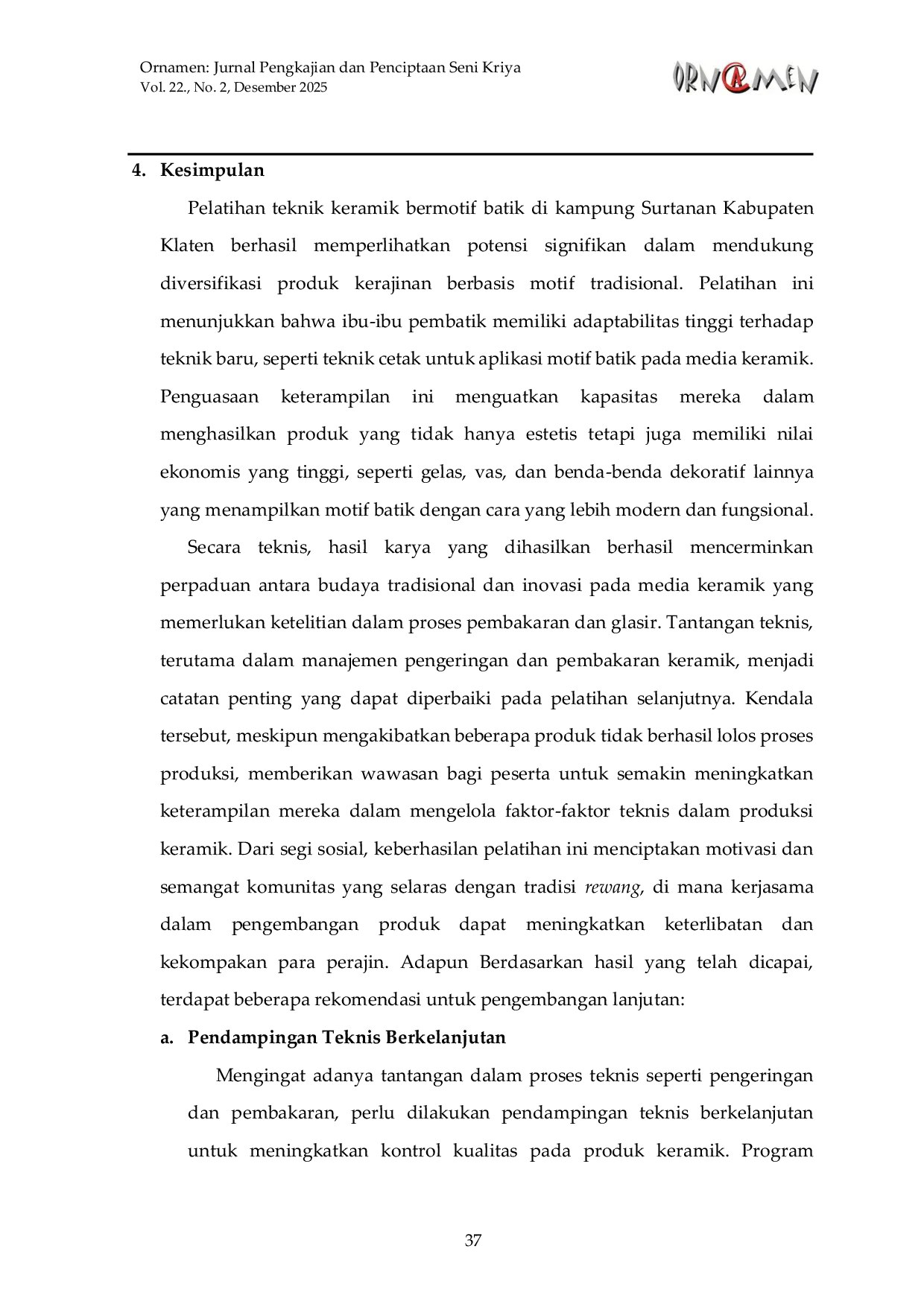 Pelatihan teknik keramik bermotif batik di kampung Surtanan Kabupaten Klaten berhasil memperlihatkan potensi signifikan dalam mendukung diversifikasi produk kerajinan berbasis motif tradisional.Pelatihan ini menunjukkan bahwa ibu-ibu pembatik memiliki adaptabilitas tinggi terhadap teknik baru, seperti teknik cetak untuk aplikasi motif batik pada media keramik.Secara teknis, hasil karya yang dihasilkan berhasil mencerminkan perpaduan antara budaya tradisional dan inovasi pada media keramik.Dengan demikian, pengembangan kapasitas teknis, inovasi produk, serta dukungan kolaboratif dapat menciptakan peluang ekonomi baru yang berbasis nilai-nilai lokal.