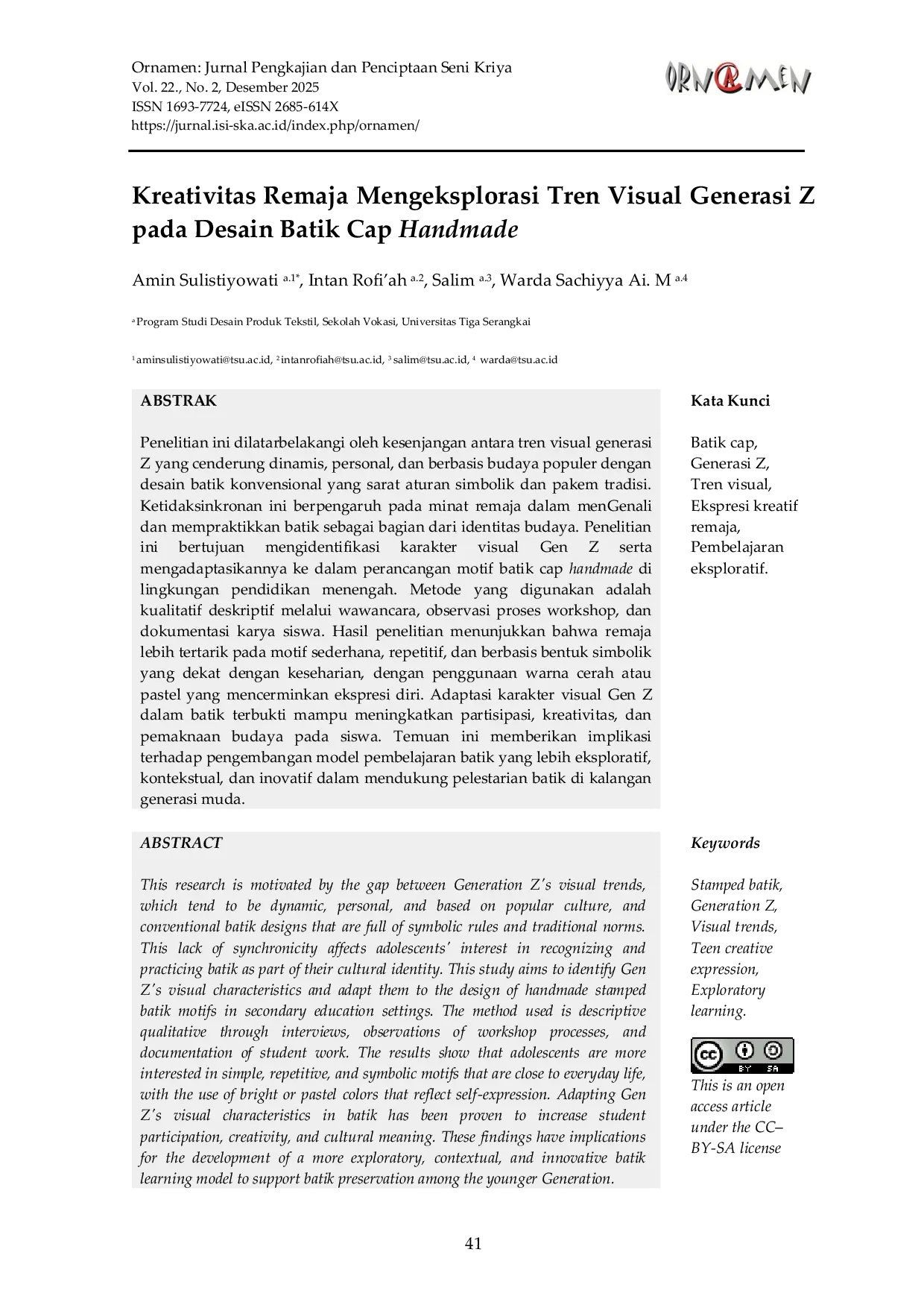 OrnamenOrnamenPenelitian ini dilatarbelakangi oleh kesenjangan antara tren visual generasi Z yang cenderung dinamis, personal, dan berbasis budaya populer dengan desain batik konvensional yang sarat aturan simbolik dan pakem tradisi. Ketidaksinkronan ini berpengaruh pada minat remaja dalam mengenali dan mempraktikkan batik sebagai bagian dari identitas budaya. Penelitian ini bertujuan mengidentifikasi karakter visual Gen Z serta mengadaptasikannya ke dalam perancangan motif batik cap handmade di lingkungan pendidikan menengah. Metode yang digunakan adalah kualitatif deskriptif melalui wawancara, observasi proses workshop, dan dokumentasi karya siswa. Hasil penelitian menunjukkan bahwa remaja lebih tertarik pada motif sederhana, repetitif, dan berbasis bentuk simbolik yang dekat dengan keseharian, dengan penggunaan warna cerah atau pastel yang mencerminkan ekspresi diri. Adaptasi karakter visual Gen Z dalam batik terbukti mampu meningkatkan partisipasi, kreativitas, dan pemaknaan budaya pada siswa. Temuan ini memberikan implikasi terhadap pengembangan model pembelajaran batik yang lebih eksploratif, kontekstual, dan inovatif dalam mendukung pelestarian batik di kalangan generasi muda.