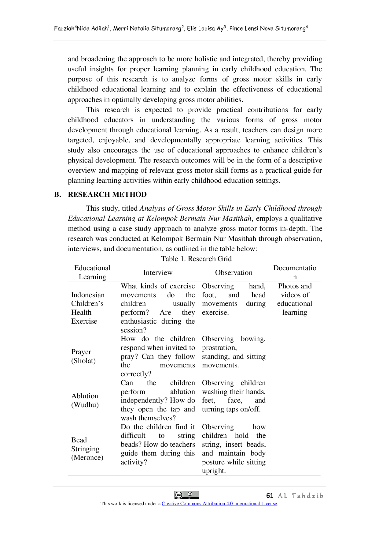 Al Tahdzib: Jurnal Pendidikan Islam Anak Usia DiniAl Tahdzib: Jurnal Pendidikan Islam Anak Usia DiniGross motor skills are essential to develop from an early age as they support childrens coordination, health, and overall development. Proper stimulation through play and educational learning effectively enhances motor abilities and prevents developmental delays. This study aims to analyze and explain the effectiveness of educational learning in optimally developing gross motor skills in early childhood. The research used a qualitative case study method with data collection techniques including interviews, observations, and documentation, while data validity was ensured through triangulation. The results show that the “Senam Sehat Anak Indonesia activity trains the ability to lift hands and feet, move the head flexibly, and stretch the body. Prayer (Sholat) develops hand, head, and body movements, as well as muscle strength to support body weight. Ablution (Wudhu) strengthens the back and hands through the act of opening taps and washing the body. Activities like beading, letter sequencing, and coloring improve balance, hand endurance, and finger-wrist flexibility through coordinated movements. Conclusion: Educational learning can stimulate various forms of gross motor skills in early childhood.