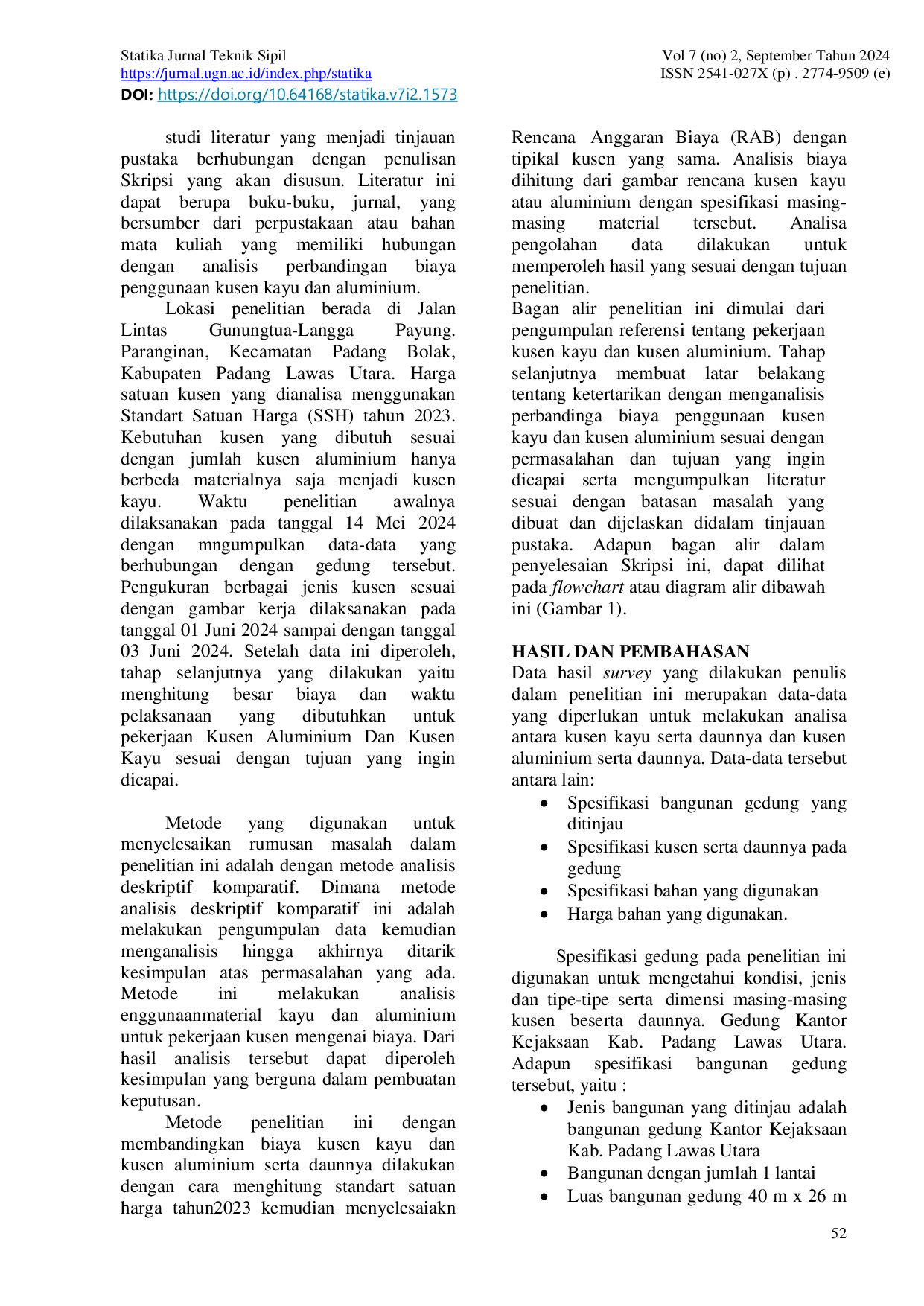 Berdasarkan analisa hasil perbandingan kusen kayu dan kusen Aluminium serta daunnya, dapat disimpulkan bahwa biaya yang dibutuhkan untuk pekerjaan kusen Aluminium lebih tinggi dibandingkan kusen kayu, yaitu Rp.Waktu pelaksanaan pekerjaan kusen kayu lebih efisien dibandingkan kusen Aluminium, dengan durasi 42 hari untuk kayu dan 38 hari untuk Aluminium dengan jumlah tukang yang sama.Selisih biaya antara kusen kayu dan Aluminium adalah Rp.191,65, dan selisih waktu pelaksanaan adalah 4 hari.