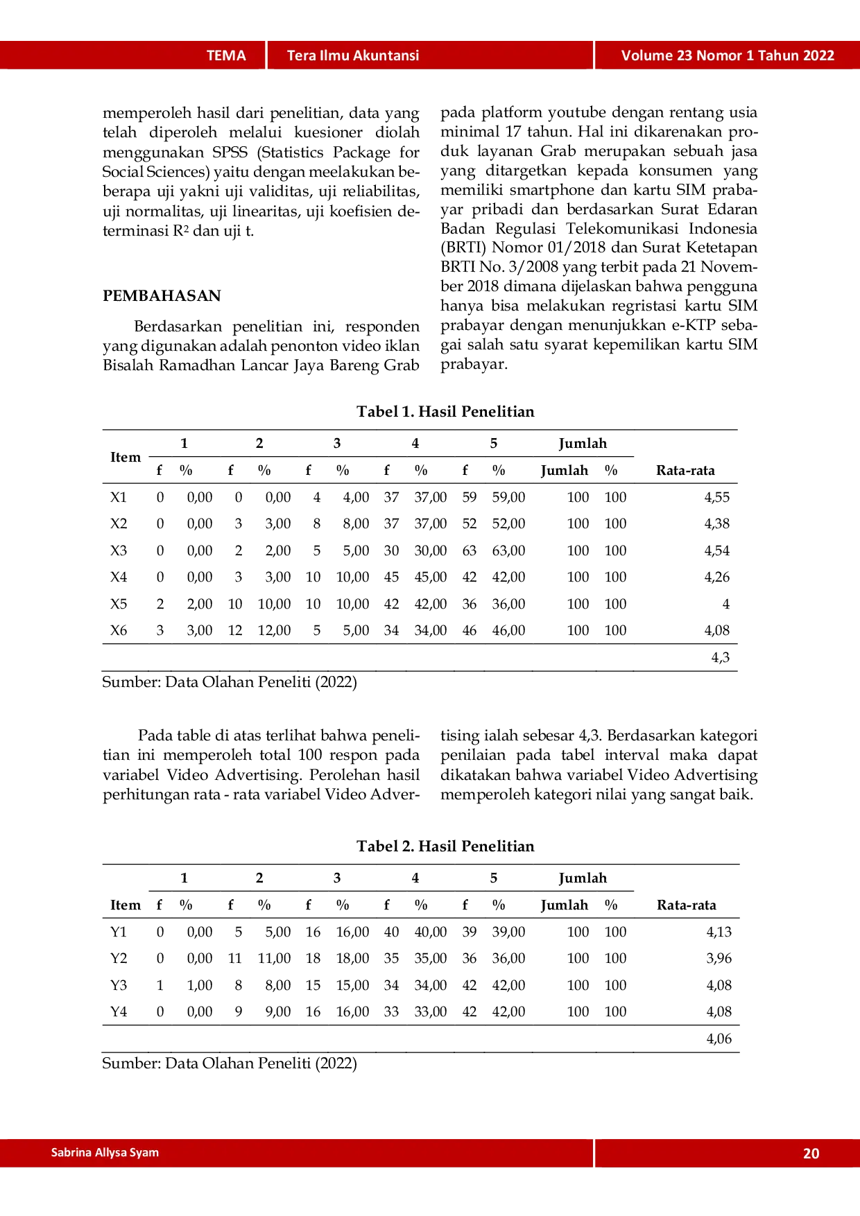 TEMATEMASalah satu bentuk iklan adalah video advertising yang merupakan strategi pemasaran menarik dan lebih dilirik oleh pengiklan dibandingkan strategi pemasaran lainnya dikarenakan video advertising atau video iklan memiliki unsur audio visual untuk menyampaikan key selling point serta membangun adanya brand image pada konsumen atau pelanggan. Penelitian ini dilakukan bertujuan untuk mengetahui apakah video advertising terbukti memberi pengaruh terhadap minat beli konsumen. Variabel independen (X) dalam penelitian ini adalah video advertising dengan indikator informativeness, entertainment, dan irritation yang diuji pengaruhnya terhadap variable dependen (Y) yaitu minat beli konsumen yang telah menonton video advertising “Bisalah Ramadhan Lancar Jaya Bareng grab! pada platform Youtube. Sampel penelitian sejumlah 100 responden yang merupakan penonton video advertising “Bisalah Ramadhan Lancar Jaya Bareng Grab! dengan kategori usia minimal 17 tahun. Seluruh data yang terkumpul dalam penelitian ini di analisis dengan menggunakan regresi linier berganda. Hasil dari penelitian ini menunjukkan bahwa indikator informativeness, entertainment, dan irritation berpengaruh terhadap minat beli konsumen dengan indikator informativeness sebagau indikator video advertising yang paling dominan terhadap minat beli konsumen.