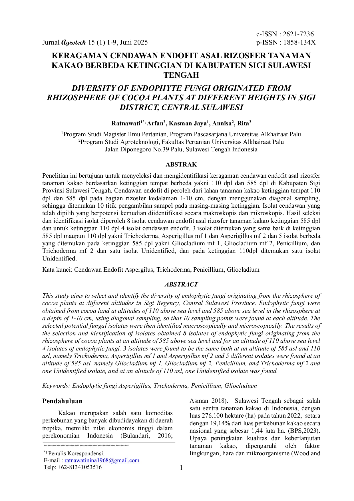 Jurnal AgrotechJurnal AgrotechPenelitian ini bertujuan untuk menyeleksi dan mengidentifikasi keragaman cendawan endofit asal rizosfer tanaman kakao berdasarkan ketinggian tempat berbeda yakni 110 dpl dan 585 dpl di Kabupaten Sigi Provinsi Sulawesi Tengah. Cendawan endofit diperoleh dari lahan tanaman kakao ketinggian tempat 110 dpl dan 585 dpl pada bagian rizosfer kedalaman 1-10 cm, dengan menggunakan diagonal sampling, sehingga ditemukan 10 titik pengambilan sampel pada masing-masing ketinggian. Isolat cendawan yang telah dipilih yang berpotensi kemudian diidentifikasi secara makroskopis dan mikroskopis. Hasil seleksi dan identifikasi isolat diperoleh 8 isolat cendawan endofit asal rizosfer tanaman kakao ketinggian 585 dpl dan untuk ketinggian 110 dpl 4 isolat cendawan endofit. 3 isolat ditemukan yang sama baik di ketinggian 585 dpl maupun 110 dpl yakni Trichoderma, Asperigillus mf 1 dan Asperigillus mf 2 dan 5 isolat berbeda yang ditemukan pada ketinggian 585 dpl yakni Gliocladium mf 1, Gliocladium mf 2, Penicillium, dan Trichoderma mf 2 dan satu isolat Unidentified, dan pada ketinggian 110dpl ditemukan satu isolat Unidentified.