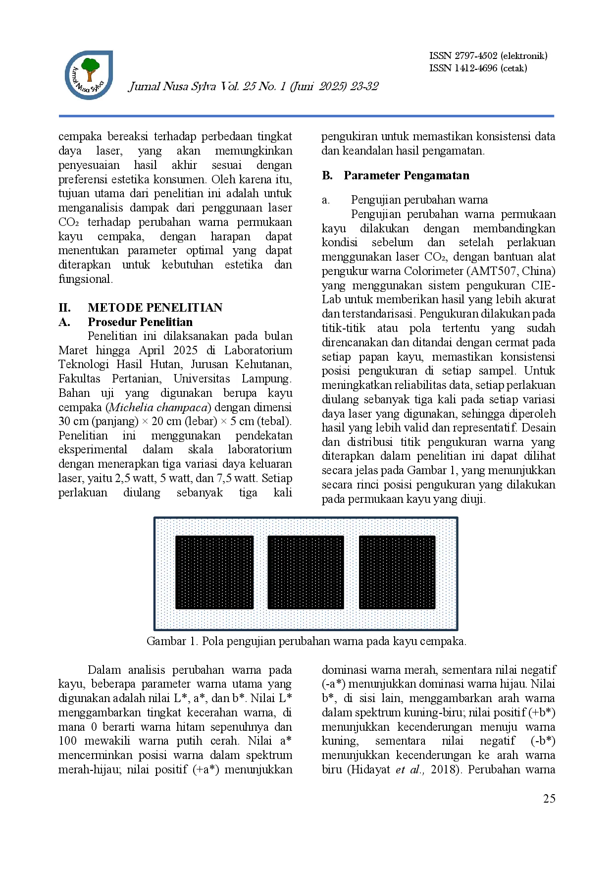 Jurnal Nusa SylvaJurnal Nusa SylvaTeknologi laser telah menjadi salah satu inovasi utama dalam pemrosesan material, khususnya dalam industri kayu untuk keperluan pemotongan dan pengukiran. Salah satu keunggulan teknologi ini adalah kemampuannya menghasilkan pola yang presisi dan estetis pada permukaan kayu. Namun, setiap jenis kayu memiliki karakteristik unik terhadap perlakuan panas dari sinar laser, sehingga diperlukan penelitian lebih lanjut untuk memahami respons spesifik dari masing-masing jenis kayu. Penelitian ini bertujuan untuk mengevaluasi pengaruh variasi daya laser CO₂ terhadap perubahan warna permukaan kayu cempaka (Michelia champaca) serta mengidentifikasi preferensi konsumen terhadap hasil warna tersebut. Penelitian dilakukan di Laboratorium Teknologi Hasil Hutan, Universitas Lampung, menggunakan tiga variasi daya laser: 2,5 watt, 5 watt, dan 7,5 watt, dengan masing-masing perlakuan diulang tiga kali. Warna permukaan dianalisis menggunakan colorimeter berbasis sistem CIE-Lab (parameter L*, a*, dan b*) sebelum dan sesudah pengukiran. Selain itu, survei preferensi konsumen dilakukan secara daring dengan melibatkan 100 mahasiswa Universitas Lampung untuk menilai visualisasi hasil pengukiran. Hasil penelitian menunjukkan bahwa daya laser yang lebih tinggi (7,5 watt) menghasilkan warna kayu yang lebih gelap dan kontras, dengan penurunan nilai L* serta peningkatan nilai a* dan b*. Sebagian besar responden menyukai hasil pengukiran menggunakan daya 7,5 watt karena menghasilkan warna yang lebih gelap dan dinilai lebih menimbulkan kesan estetika dan hasil yang lebih tajam.