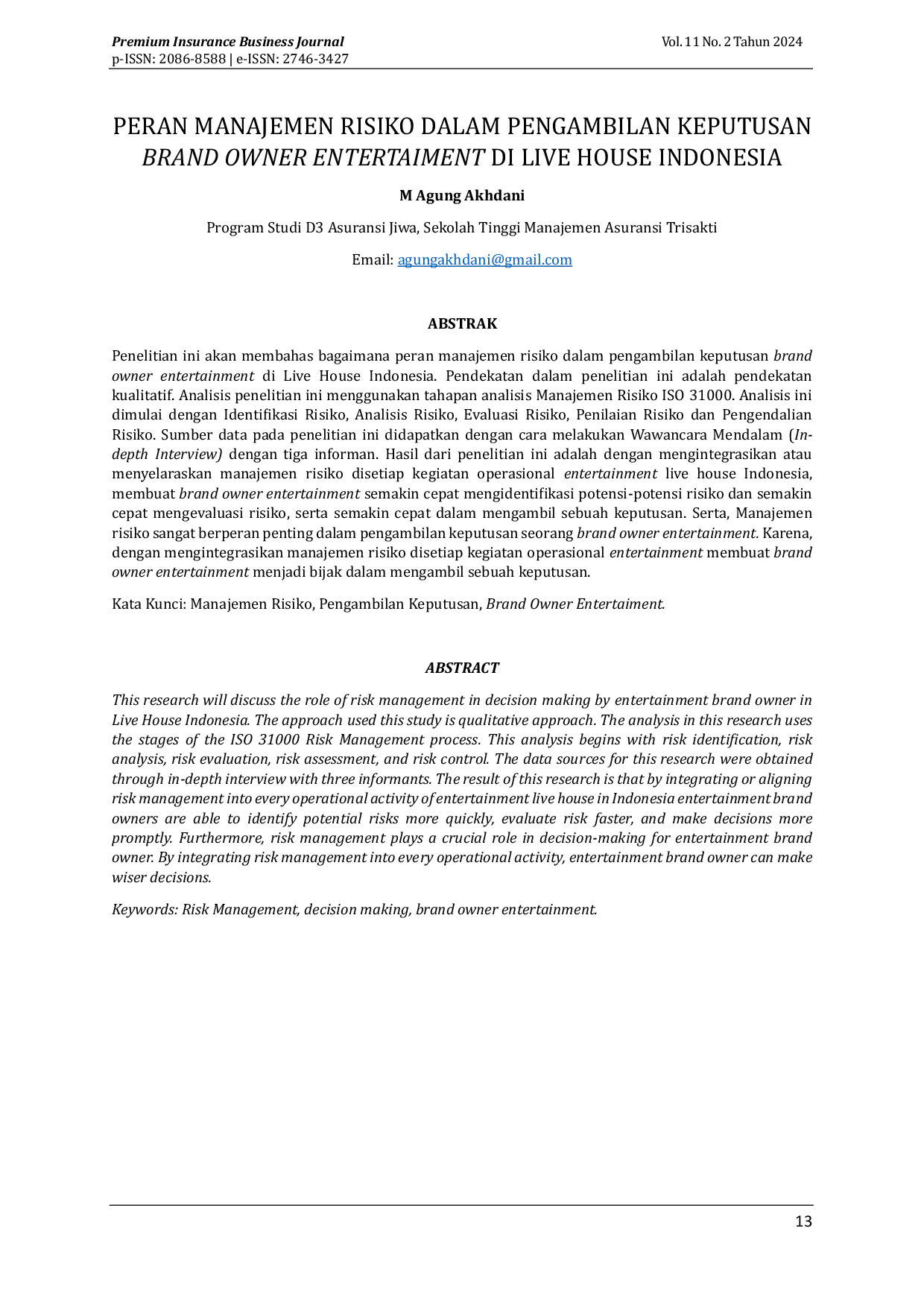 Premium Insurance Business JournalPremium Insurance Business JournalPenelitian ini membahas peran manajemen risiko dalam pengambilan keputusan brand owner entertainment di Live House Indonesia. Pendekatan yang digunakan adalah pendekatan kualitatif dengan analisis berdasarkan tahapan Manajemen Risiko ISO 31000, meliputi Identifikasi Risiko, Analisis Risiko, Evaluasi Risiko, Penilaian Risiko, dan Pengendalian Risiko. Data diperoleh melalui wawancara mendalam dengan tiga informan. Hasil penelitian menunjukkan bahwa integrasi manajemen risiko dalam setiap kegiatan operasional entertainment live house Indonesia memungkinkan brand owner entertainment untuk lebih cepat mengidentifikasi dan mengevaluasi risiko, serta mengambil keputusan yang lebih bijaksana. Manajemen risiko berperan penting dalam pengambilan keputusan karena membantu brand owner entertainment membuat keputusan yang bijak dalam setiap kegiatan operasional.