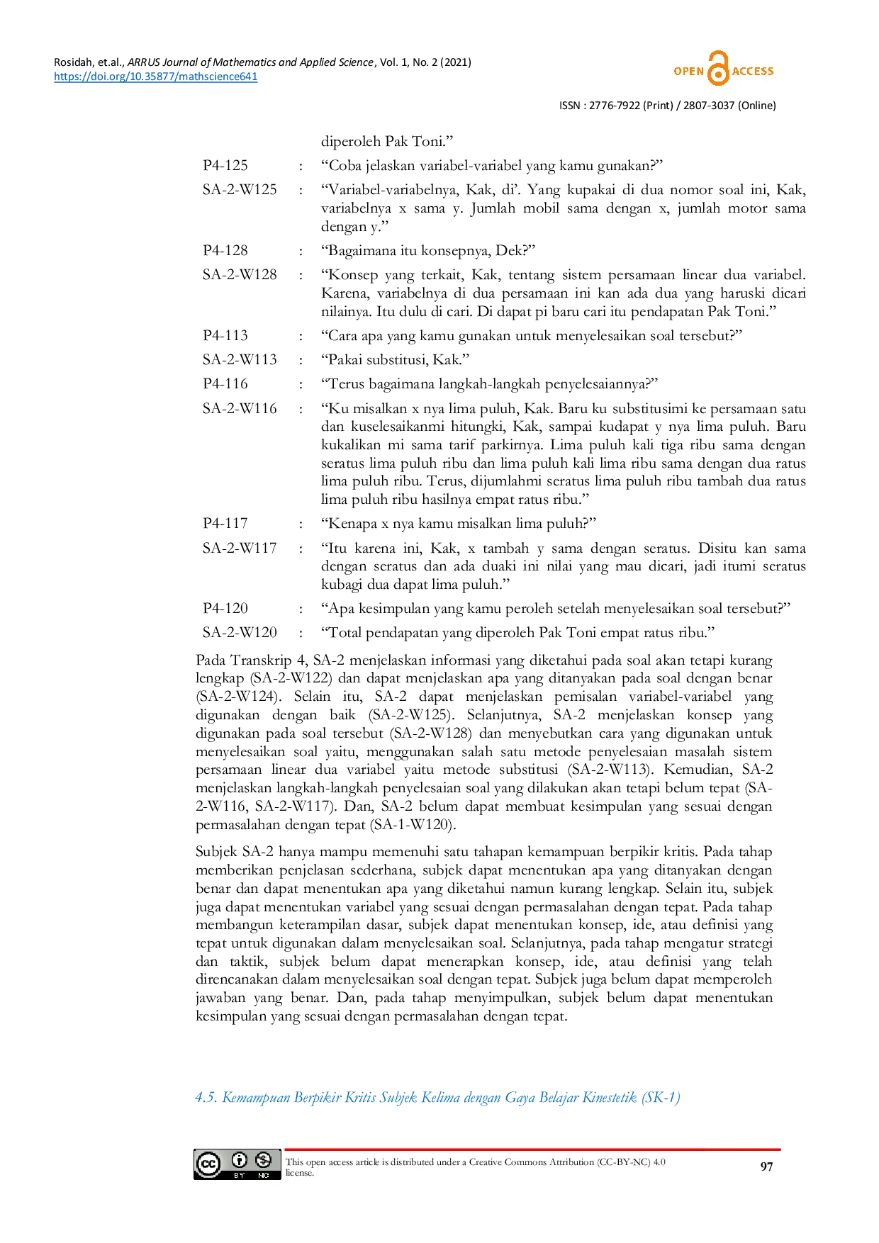 Siswa dengan gaya belajar visual mampu memenuhi seluruh indikator kemampuan berpikir kritis dalam menyelesaikan soal open-ended.Siswa dengan gaya belajar auditorial hanya mampu memenuhi indikator pada tahap membangun keterampilan dasar, namun mengalami kesulitan dalam memberikan penjelasan sederhana, mengatur strategi, dan menarik kesimpulan.Siswa dengan gaya belajar kinestetik mengalami kesulitan pada hampir semua tahapan kemampuan berpikir kritis, termasuk membangun keterampilan dasar, mengatur strategi, dan menarik kesimpulan.