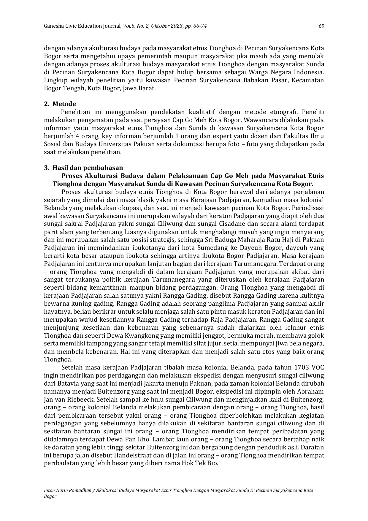 Ganesha Civic Education JournalGanesha Civic Education JournalTujuan penelitian ini adalah untuk mengetahui proses akulturasi budaya Cap Go Meh pada masyarakat etnis Tionghoa dengan masyarakat Sunda di Kota Bogor dan mengetahui upaya yang dilakukan baik dari pemerintah maupun masyarakat dengan adanya proses dapat hidup bersama sebagai Warga Negara Indonesia. Menggunakan pendekatan kualitatif dengan metode etnografi. Peneliti melakukan pengamatan pada saat perayaan Cap Go Meh Kota Bogor tanggal 08 Februari 2020. Wawancara dilakukan pada informan yaitu masyarakat etnis Tionghoa dan Sunda di kawasan Suryakencana Kota Bogor berjumlah 4 orang, key informant berjumlah 1 orang dan expert yaitu dosen dari Fakultas Ilmu Sosial dan Budaya Universitas Pakuan. Berdasarkan hasil penelitian dapat disimpulkan: Proses akulturasi budaya selain dalam perayaan Cap Go Meh Kota Bogor dengan tetap menampilkan kesenian dan budaya Tionghoa dan turut menampilkan kesenian dan budaya Sunda pada sisi lain terdapat akulturasi budaya yang ditemukan dalam berbagai bidang kehidupan seperti bidang ekonomi, bahasa, makanan. Upaya pemerintah dan masyarakat dengan saling menghargai dan tidak pandang bulu dalam memberi dukungan untuk meyukseskan Cap Go Meh. Jadi, dengan begitu masyarakat Kota Bogor dapat hidup bersama sebagai Warga Negara Indonesia.