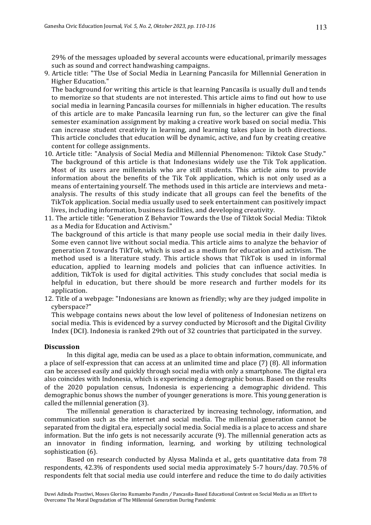 Ganesha Civic Education JournalGanesha Civic Education JournalThe COVID-19 pandemic is currently attacking Indonesia and encouraging an increase in internet consumption, especially social media. Freedom to access information can have both positive and negative impacts on the millennial generation. One of the negative impacts is moral decline or moral degradation. This article aims to find out how to overcome moral degradation among the millennial generation through Pancasila-based educational content. The method used is literature review by searching for journal articles from Google Scholar and ebooks from 2019 to 2021. By combining several keywords, the author formulates several research questions: (a) what are millennials and social media? (b) how the impact of social media on the moral character of the millennial generation?, and (c) how to overcome moral degradation among the millennial generation? Based on the analysis of research findings, ten journals met the inclusion of reviews based on research content. This research is motivated by the moral degradation of the millennial generation as a negative impact of the use of social media. The ten articles collected show that creating educational and informative content based on Pancasila can overcome moral degradation on social media. In addition, media literacy can also overcome moral degradation.