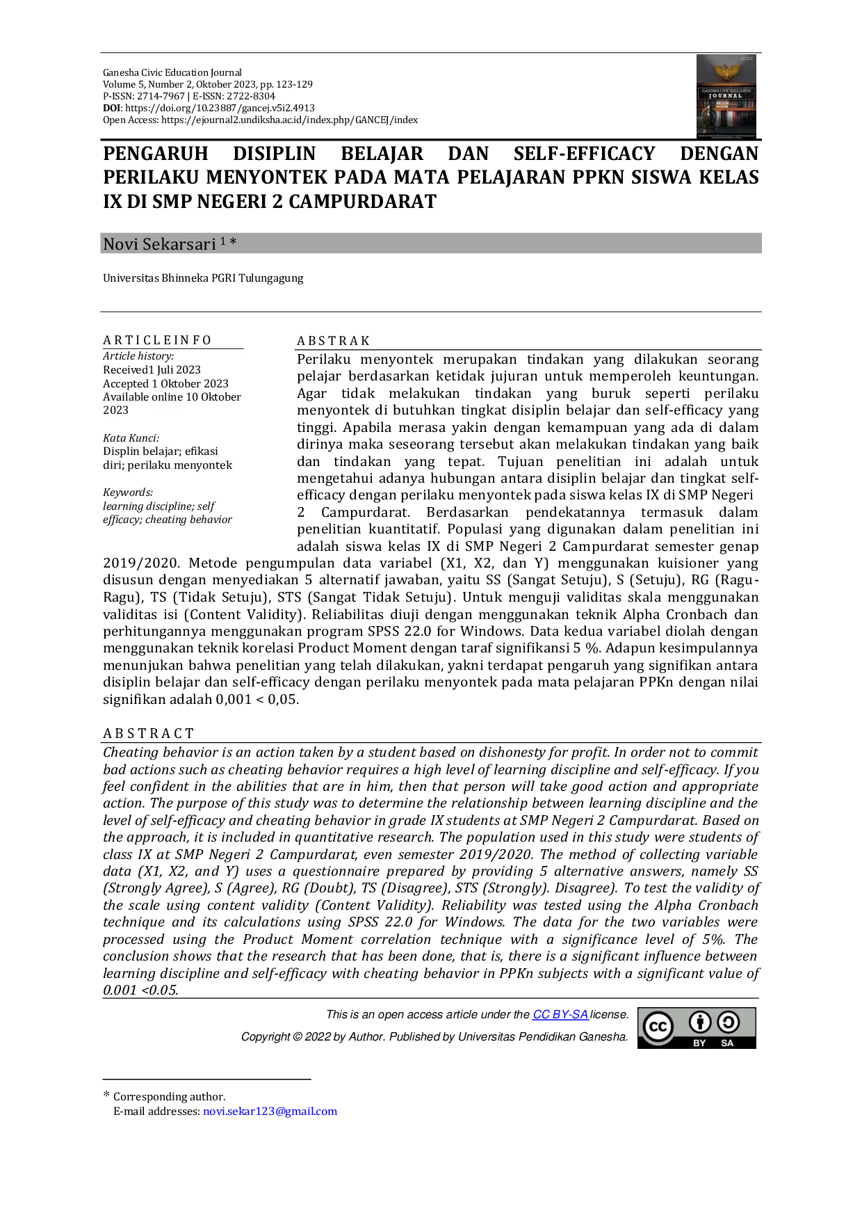 Ganesha Civic Education JournalGanesha Civic Education JournalPerilaku menyontek merupakan tindakan yang dilakukan seorang pelajar berdasarkan ketidakjujuran untuk memperoleh keuntungan. Untuk mencegah tindakan buruk seperti perilaku menyontek, diperlukan tingkat disiplin belajar dan self-efficacy yang tinggi. Apabila merasa yakin dengan kemampuan yang ada di dalam dirinya, maka seseorang akan melakukan tindakan yang baik dan tepat. Penelitian ini bertujuan untuk mengetahui adanya hubungan antara disiplin belajar dan tingkat self-efficacy dengan perilaku menyontek pada siswa kelas IX di SMP Negeri 2 Campurdarat. Penelitian ini menggunakan pendekatan kuantitatif. Populasi yang digunakan adalah siswa kelas IX di SMP Negeri 2 Campurdarat semester genap 2019/2020. Data dikumpulkan menggunakan kuesioner dengan 5 alternatif jawaban (SS, S, RG, TS, STS). Validitas skala diuji menggunakan validitas isi (Content Validity), dan reliabilitas diuji dengan teknik Alpha Cronbach menggunakan program SPSS 22.0 for Windows. Hasil penelitian menunjukkan bahwa terdapat pengaruh signifikan antara disiplin belajar dan self-efficacy dengan perilaku menyontek pada mata pelajaran PPKn dengan nilai signifikan 0,001 < 0,05.