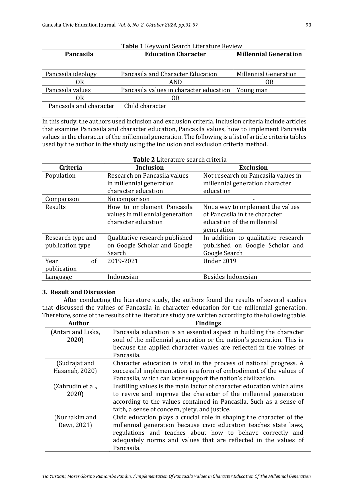 Ganesha Civic Education JournalGanesha Civic Education JournalPendidikan di Indonesia belum mencapai hasil yang optimal, terutama dalam pendidikan karakter bagi generasi milenial. Pendidikan karakter sangat penting untuk ditanamkan kepada anak karena pendidikan karakter merupakan pendidikan yang mengembangkan sikap, nilai, dan perilaku yang dapat memunculkan akhlak mulia yang berbudi pekerti luhur, yang semuanya merupakan wujud dari nilai-nilai Pancasila. Tujuan dari penelitian ini adalah untuk mengetahui bagaimana mengimplementasikan nilai-nilai Pancasila dalam pendidikan karakter. Metode penelitian ini menggunakan pendekatan kualitatif dengan metode studi pustaka yang menggunakan artikel penelitian. Hasil dari metode ini mendapatkan sepuluh artikel terpilih kemudian dianalisis menggunakan tabel dengan kata kunci Pancasila, pendidikan karakter, dan generasi milenial. Hasil penelitian menjelaskan bahwa generasi milenial harus memiliki akhlak dan moral yang baik dalam kehidupannya, maka mereka tentu tidak akan pernah melupakan nilai-nilai luhur bangsa Indonesia yang akan menjadi generasi penerus bangsa. Implikasi penelitian ini adalah dapat memberikan kerangka kerja atau instrumen evaluasi yang lebih baik untuk mengukur efektivitas implementasi nilai-nilai Pancasila dalam pendidikan karakter generasi milenial. Ini penting untuk memastikan bahwa upaya yang dilakukan memberikan dampak yang diharapkan.