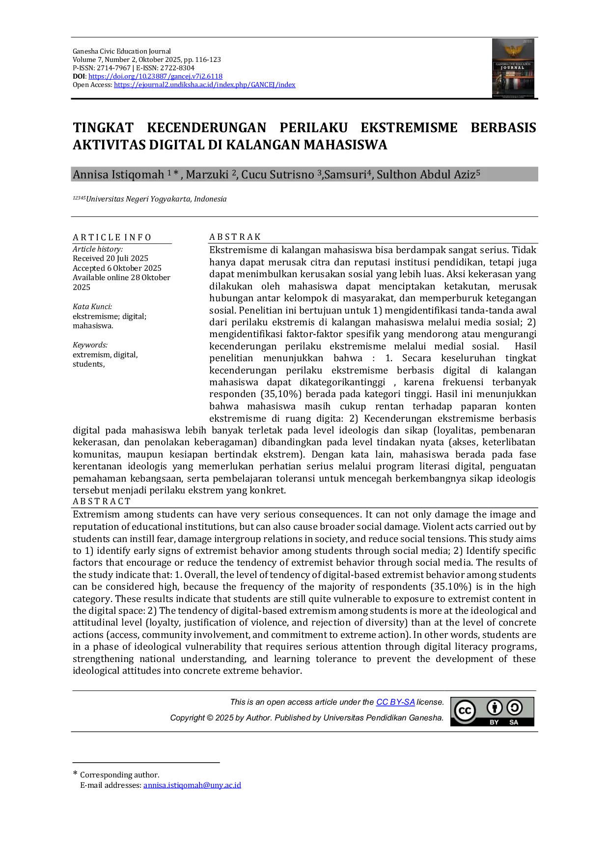 Ganesha Civic Education JournalGanesha Civic Education JournalEkstremisme di kalangan mahasiswa dapat memiliki konsekuensi yang sangat serius, tidak hanya merusak citra institusi pendidikan tetapi juga menimbulkan kerusakan sosial yang lebih luas. Penelitian ini bertujuan untuk 1) mengidentifikasi tanda-tanda awal perilaku ekstremis di kalangan mahasiswa melalui media sosial; 2) mengidentifikasi faktor-faktor spesifik yang mendorong atau mengurangi kecenderungan perilaku ekstremisme melalui media sosial. Hasil penelitian menunjukkan bahwa tingkat kecenderungan perilaku ekstremisme berbasis digital di kalangan mahasiswa dapat dikategorikan tinggi, karena frekuensi terbanyak responden (35,10%) berada pada kategori tinggi. Kecenderungan ekstremisme berbasis digital pada mahasiswa lebih banyak terletak pada level ideologis dan sikap (loyalitas, pembenaran kekerasan, dan penolakan keberagaman) dibandingkan pada level tindakan nyata (akses, keterlibatan komunitas, maupun kesiapan bertindak ekstrem). Dengan kata lain, mahasiswa berada pada fase kerentanan ideologis yang memerlukan perhatian serius melalui program literasi digital, penguatan pemahaman kebangsaan, serta pembelajaran toleransi untuk mencegah berkembangnya sikap ideologis tersebut menjadi perilaku ekstrem yang konkret.