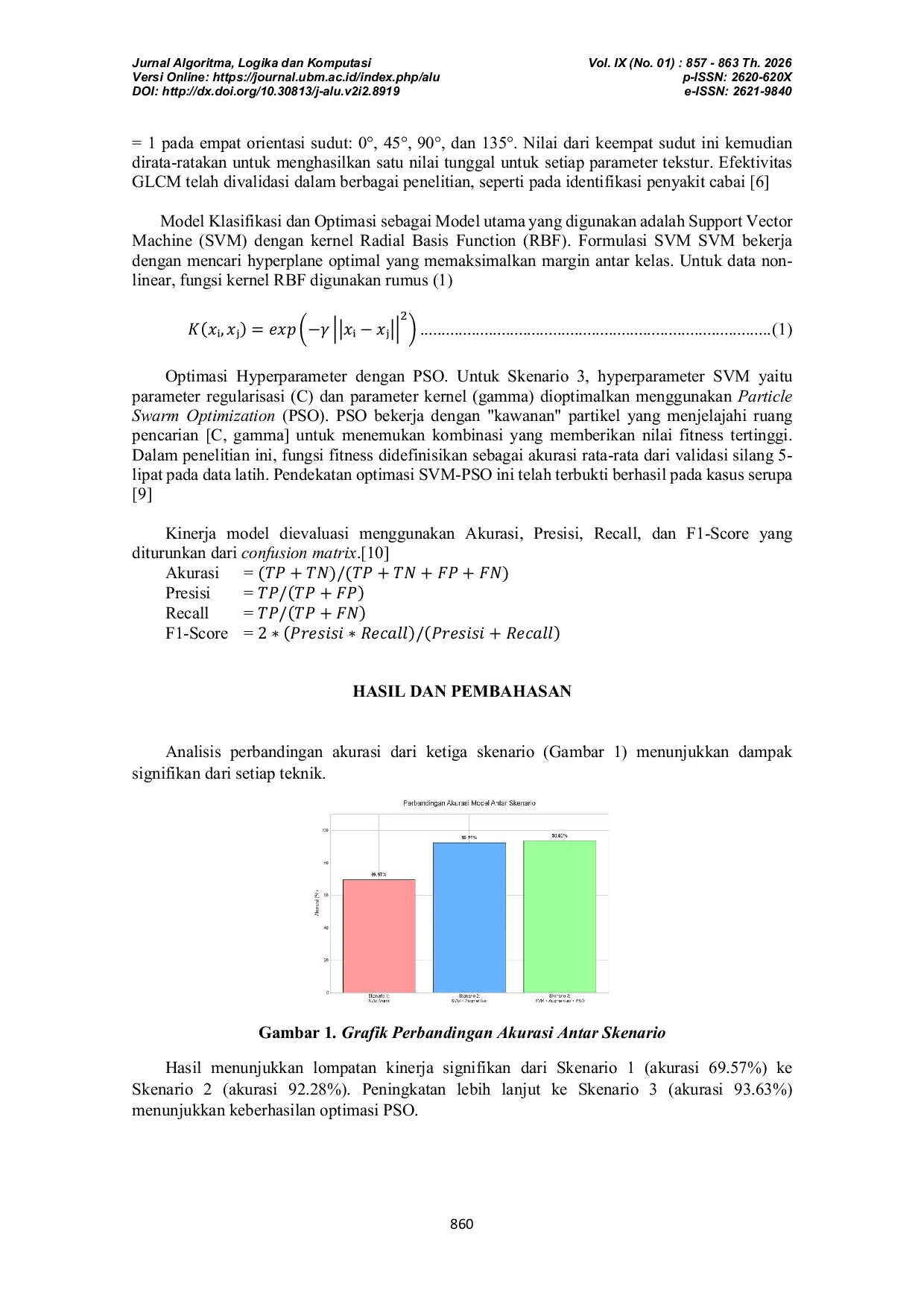 Jurnal Algoritma, Logika dan KomputasiJurnal Algoritma, Logika dan KomputasiSelada (Lactuca sativa L.) merupakan komoditas hortikultura bernilai ekonomi tinggi, namun produktivitasnya sering terhambat oleh serangan penyakit. Identifikasi manual oleh petani seringkali tidak akurat karena kemiripan gejala visual antar penyakit. Penelitian ini bertujuan untuk membangun sistem identifikasi penyakit otomatis menggunakan Support Vector Machine (SVM) berbasis ekstraksi fitur visual. Penelitian berfokus pada klasifikasi empat kondisi daun selada: Sehat, Bercak Daun Cercospora (disebabkan oleh Cercospora longissima), Tipburn, dan Etiolasi. Metodologi yang digunakan meliputi ekstraksi fitur warna dari ruang warna HSV dan fitur tekstur menggunakan Gray-Level Co-occurrence Matrix (GLCM). Efektivitas augmentasi data dan optimasi hyperparameter menggunakan Particle Swarm Optimization (PSO) juga dievaluasi melalui tiga skenario perbandingan. Hasil penelitian menunjukkan bahwa augmentasi data secara signifikan meningkatkan akurasi model dari baseline 69,57% menjadi 92,28%. Optimasi lebih lanjut dengan PSO berhasil meningkatkan performa hingga mencapai akurasi final sebesar 93,63%. Model terbaik menunjukkan F1-Score yang seimbang di atas 0,91 untuk semua kelas, membuktikan bahwa kombinasi metode ekstraksi fitur HSV dan GLCM, augmentasi data, dan optimasi SVM menggunakan PSO merupakan pendekatan yang andal dan efektif untuk identifikasi penyakit daun selada, serta menawarkan alat bantu yang prospektif untuk pertanian presisi.