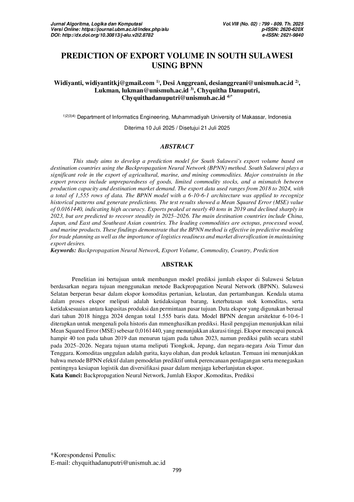 Jurnal Algoritma, Logika dan KomputasiJurnal Algoritma, Logika dan KomputasiPenelitian ini bertujuan untuk membangun model prediksi jumlah ekspor di Sulawesi Selatan berdasarkan negara tujuan menggunakan metode Backpropagation Neural Network (BPNN). Sulawesi Selatan berperan besar dalam ekspor komoditas pertanian, kelautan, dan pertambangan. Kendala utama dalam proses ekspor meliputi ketidaksiapan barang, keterbatasan stok komoditas, dan ketidaksesuaian antara kapasitas produksi dan permintaan pasar tujuan. Data ekspor yang digunakan berasal dari tahun 2018 hingga 2024 dengan total 1.555 baris data. Model BPNN dengan arsitektur 6-10-6-1 diterapkan untuk mengenali pola historis dan menghasilkan prediksi. Hasil pengujian menunjukkan nilai Mean Squared Error (MSE) sebesar 0,0161440, yang menunjukkan akurasi tinggi. Ekspor mencapai puncak hampir 40 ton pada tahun 2019 dan menurun tajam pada 2023, namun diprediksi pulih secara stabil pada 2025–2026. Negara tujuan utama meliputi Tiongkok, Jepang, dan negara-negara Asia Timur dan Tenggara. Komoditas unggulan adalah gurita, kayu olahan, dan produk kelautan. Temuan ini menunjukkan bahwa metode BPNN efektif dalam pemodelan prediktif untuk perencanaan perdagangan serta menegaskan pentingnya kesiapan logistik dan diversifikasi pasar dalam menjaga keberlanjutan ekspor.